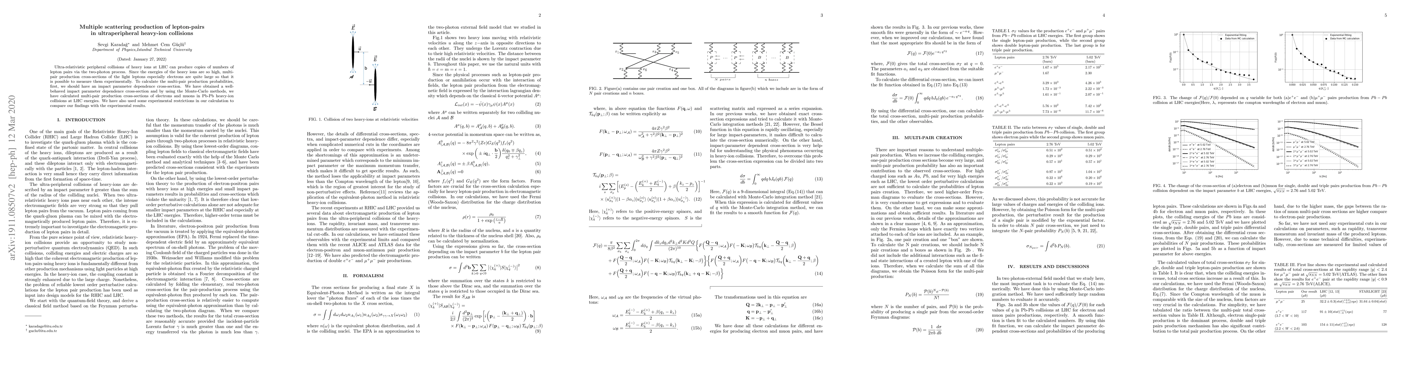 Ultra-relativistic peripheral collisions of heavy ions at LHC can produce copies of numbers of lepton pairs via the two-photon process. Since the energy of the heavy ions is so high, multi-pair production cross-sections of the light leptons especially electrons are quite large so that it is possible to measure them experimentally. To calculate the multi-pair production probabilities, first, we should have an impact parameter dependence cross-section. We have obtained a well-behaved impact parameter dependence cross-section and by using the Monte-Carlo methods, we have calculated multi-pair production cross-sections of electrons and muons in Pb-Pb heavy-ion collisions at LHC energies. We have also used some experimental restrictions in our calculation to compare our findings with the experimental results.