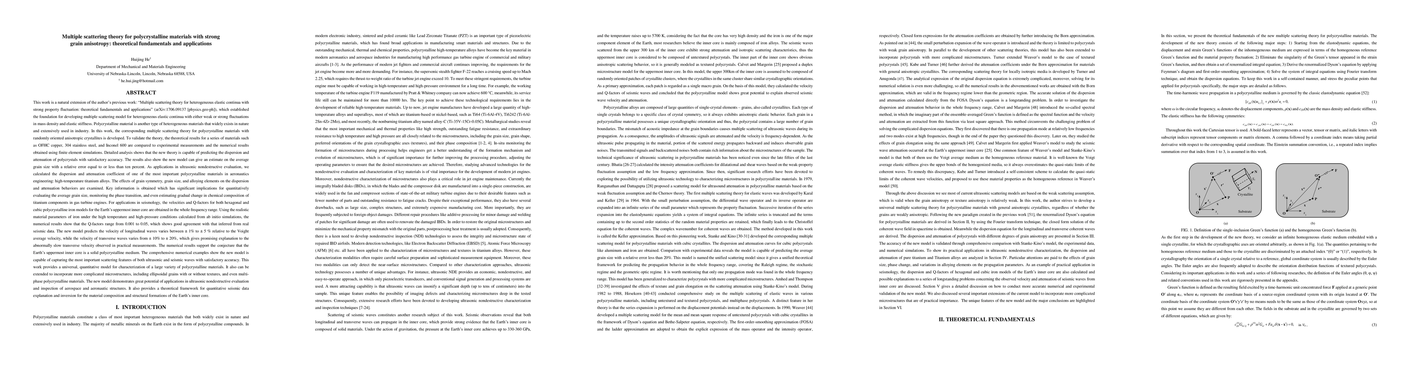 This paper extends multiple scattering theory to model polycrystalline materials with strong grain anisotropy, focusing on titanium alloys and polycrystalline iron. It provides quantitative models for evaluating grain size, phase transitions, and chemical composition changes in aerospace applications, as well as for interpreting seismic data for Earth's inner core composition and structure.
