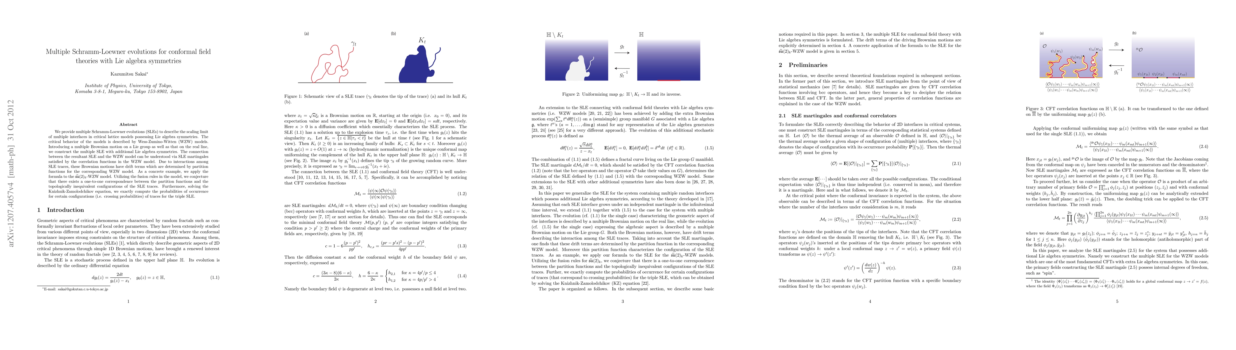 This paper introduces multiple Schramm-Loewner evolutions (SLEs) to describe the scaling limit of multiple interfaces in critical lattice models with Lie algebra symmetries, linking them to Wess-Zumino-Witten models. It conjectures a one-to-one correspondence between partition functions and topologically inequivalent SLE configurations, and computes crossing probabilities for the triple SLE in the su(2)_k-WZW model.