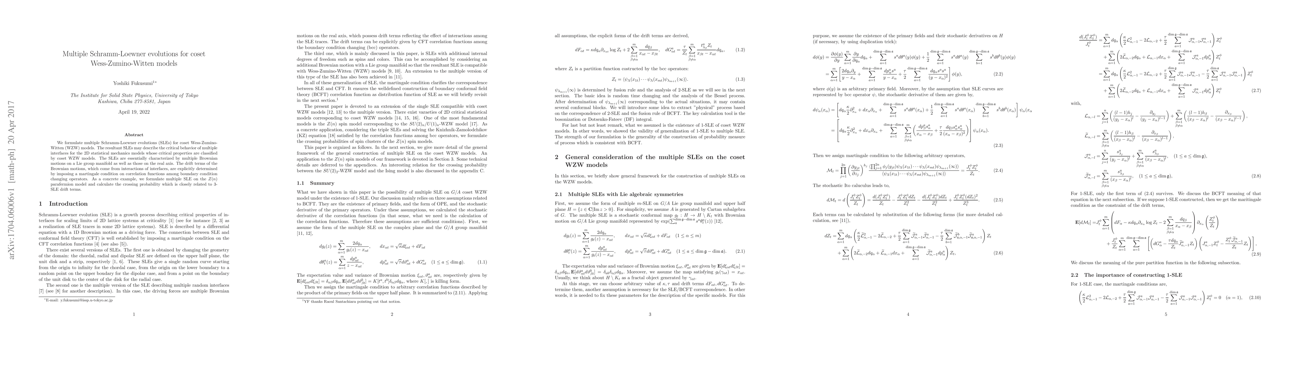This paper formulates multiple Schramm-Loewner evolutions (SLEs) for coset Wess-Zumino-Witten (WZW) models to describe critical behaviors of multiple interfaces in 2D statistical mechanics. The SLEs involve Brownian motions on both Lie group manifolds and the real axis, with drift terms determined by a martingale condition on boundary condition changing operators. A specific example is given in the $Z(n)$ parafermion model, where crossing probabilities related to 3-SLE drift terms are calculated.