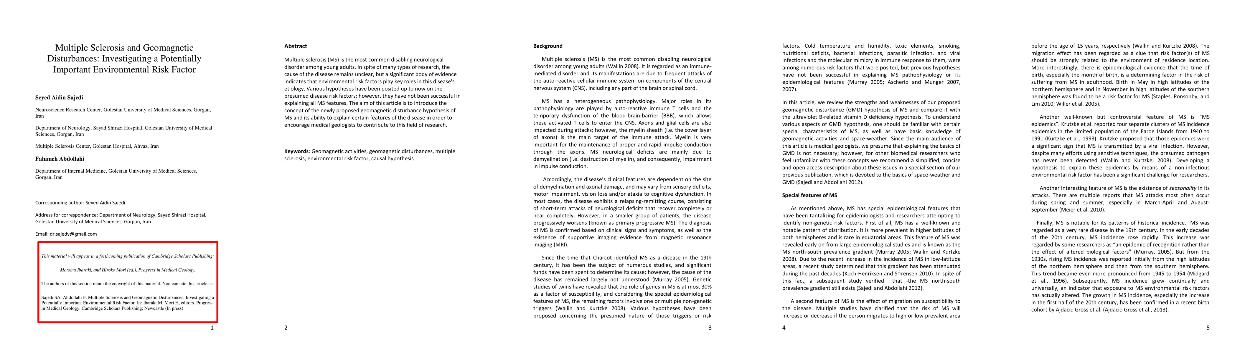 Multiple sclerosis (MS) is the most common disabling neurological disorders in the young adults. In spite of many researches, the cause of the disease has remained mainly not understood. All evidences indicate that environmental risk factors play key roles in this disease etiology. Various hypotheses have been posited up to now on the presumed disease risk factors, however, they were not successful in explaining all MS features. The aim of this article is to introduce the concept of the newly proposed "geomagnetic disturbance hypothesis of MS" and its abilities in explaining the special features of the disease to encourage medical geologist and other biomedical researchers to contribute to this area of research.