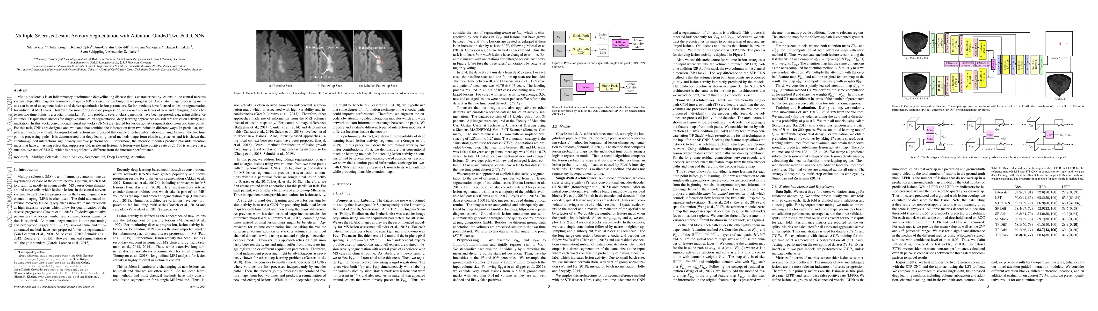 This paper proposes attention-guided convolutional neural networks (CNNs) for segmenting lesion activity in multiple sclerosis from MRI scans taken at two time points. The two-path CNN architecture with attention-guided interactions effectively exchanges information between the two time points, outperforming classic methods and achieving a lesion-wise false positive rate of 26.4% at a true positive rate of 74.2%.