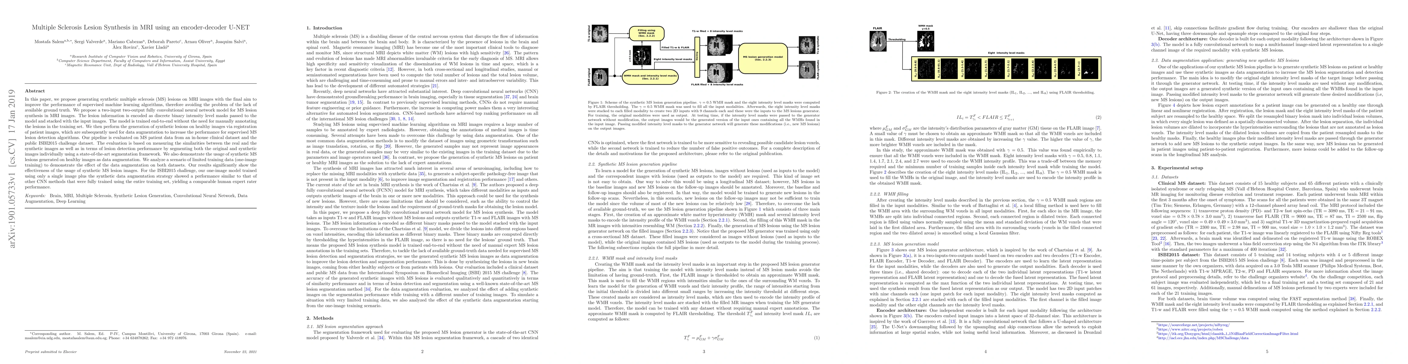 This paper proposes a fully convolutional neural network model using an encoder-decoder U-NET architecture to generate synthetic multiple sclerosis lesions on MRI images for data augmentation, improving supervised machine learning performance. The model synthesizes lesions without manual annotations, and the generated images are evaluated for similarity and lesion detection performance, showing effectiveness even with limited training data.