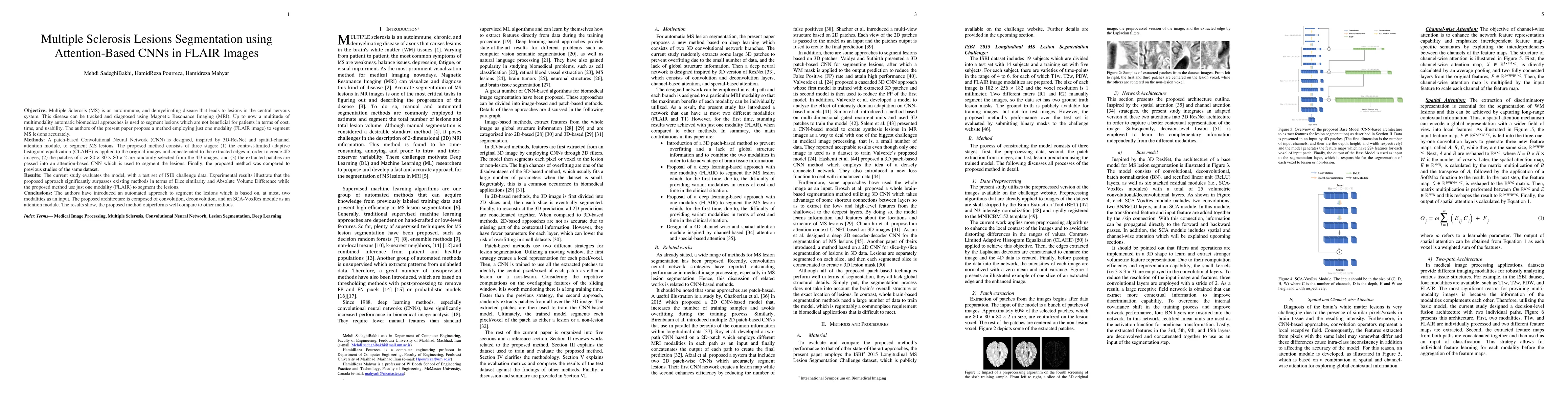 Objective: Multiple Sclerosis (MS) is an autoimmune, and demyelinating disease that leads to lesions in the central nervous system. This disease can be tracked and diagnosed using Magnetic Resonance Imaging (MRI). Up to now a multitude of multimodality automatic biomedical approaches is used to segment lesions which are not beneficial for patients in terms of cost, time, and usability. The authors of the present paper propose a method employing just one modality (FLAIR image) to segment MS lesions accurately. Methods: A patch-based Convolutional Neural Network (CNN) is designed, inspired by 3D-ResNet and spatial-channel attention module, to segment MS lesions. The proposed method consists of three stages: (1) the contrast-limited adaptive histogram equalization (CLAHE) is applied to the original images and concatenated to the extracted edges in order to create 4D images; (2) the patches of size 80 * 80 * 80 * 2 are randomly selected from the 4D images; and (3) the extracted patches are passed into an attention-based CNN which is used to segment the lesions. Finally, the proposed method was compared to previous studies of the same dataset. Results: The current study evaluates the model, with a test set of ISIB challenge data. Experimental results illustrate that the proposed approach significantly surpasses existing methods in terms of Dice similarity and Absolute Volume Difference while the proposed method use just one modality (FLAIR) to segment the lesions. Conclusions: The authors have introduced an automated approach to segment the lesions which is based on, at most, two modalities as an input. The proposed architecture is composed of convolution, deconvolution, and an SCA-VoxRes module as an attention module. The results show, the proposed method outperforms well compare to other methods.