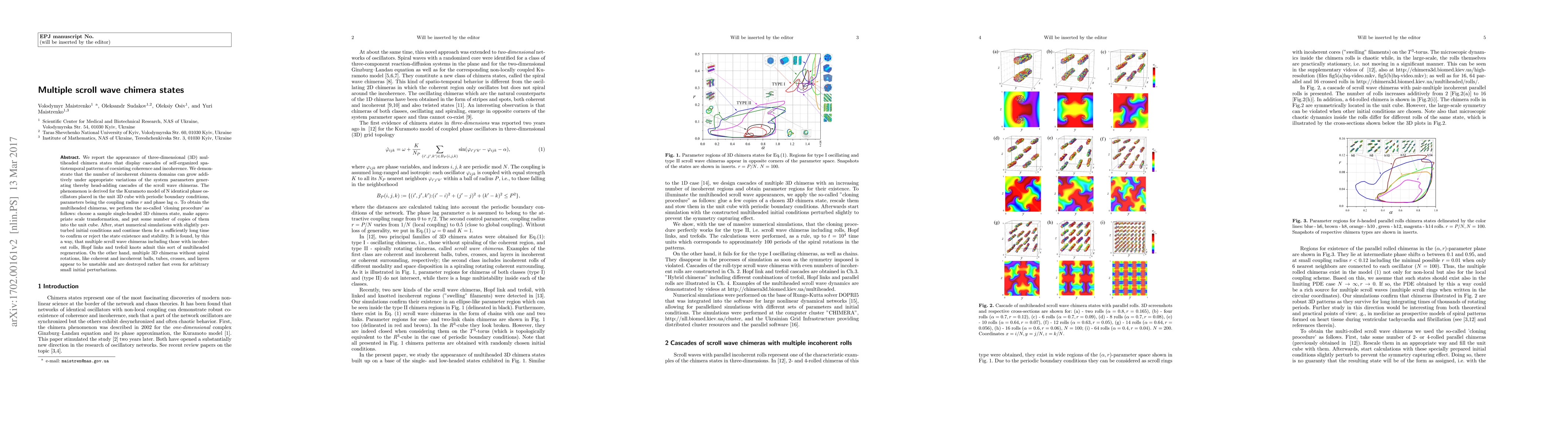 This paper investigates the emergence of three-dimensional multiheaded chimera states in a Kuramoto model of phase oscillators, showing how incoherent domains can grow additively to form head-adding cascades of scroll wave chimeras. The stability of these chimeras is confirmed through numerical simulations, revealing that certain complex structures like incoherent rolls and Hopf links are stable, while simpler forms like coherent and incoherent balls and tubes are unstable.