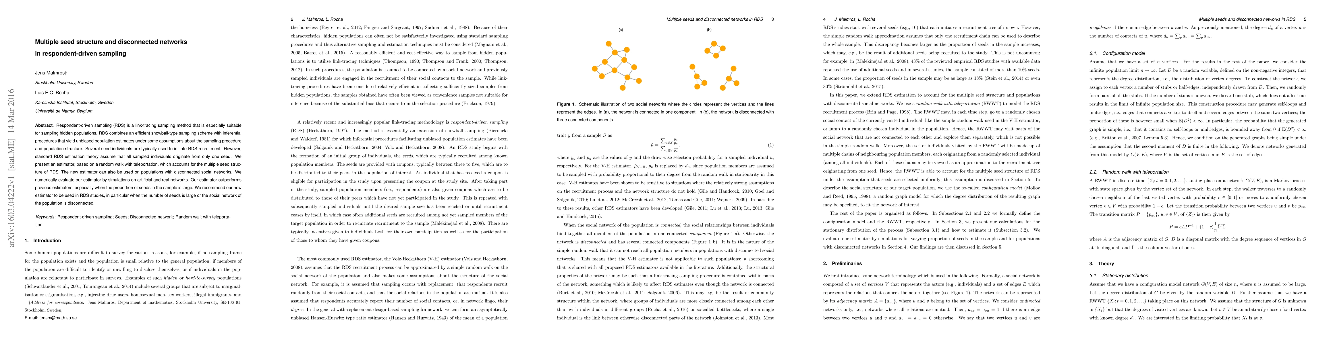 This paper proposes a new estimator for respondent-driven sampling (RDS) that accounts for multiple seed structures and disconnected social networks, outperforming previous estimators. The new estimator, based on a random walk with teleportation, is recommended for RDS studies where the number of seeds is large or the network is disconnected.