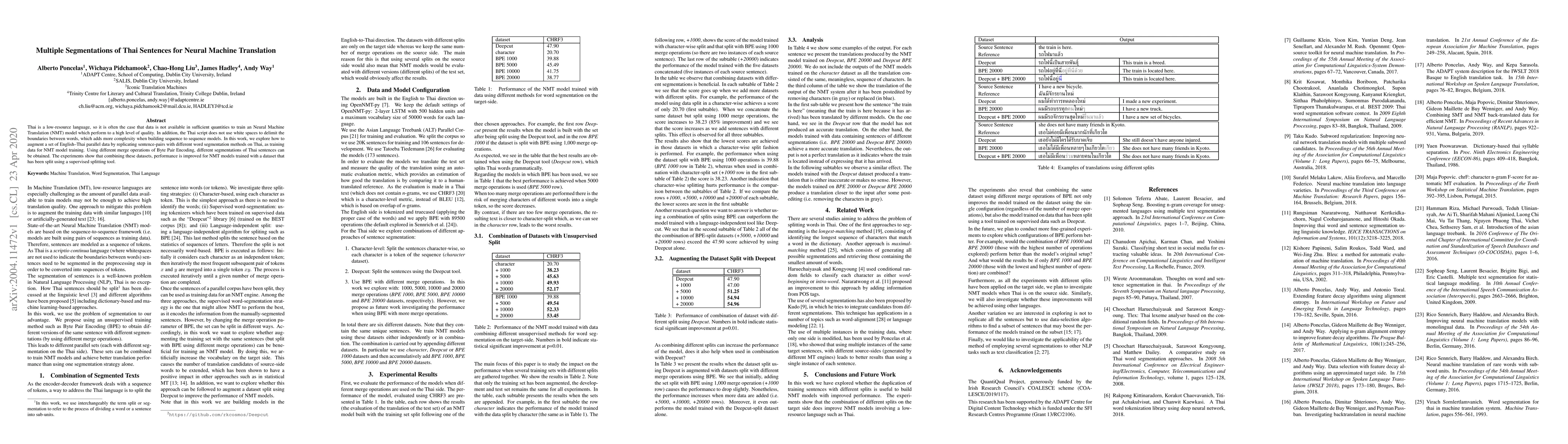 This paper investigates augmenting a low-resource English-Thai parallel dataset for Neural Machine Translation by applying various word segmentation methods on Thai sentences, including different merge operations of Byte Pair Encoding. The results indicate that combining these segmentations enhances the performance of NMT models.