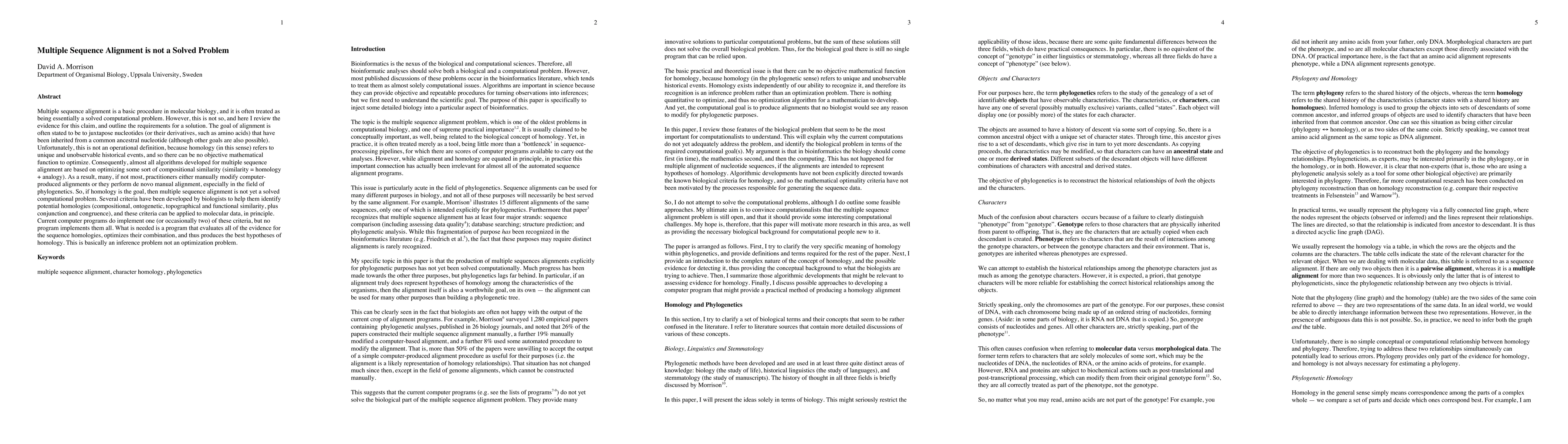 Multiple sequence alignment, a crucial procedure in molecular biology, is not considered a solved computational problem due to the unobservable nature of historical homology. Current algorithms optimize compositional similarity rather than homology, leading to manual adjustments by practitioners. The paper suggests the need for a comprehensive program that evaluates all criteria of sequence similarity (compositional, ontogenetic, topographical, and functional) and optimizes their combination to address the inference problem, not just an optimization problem.