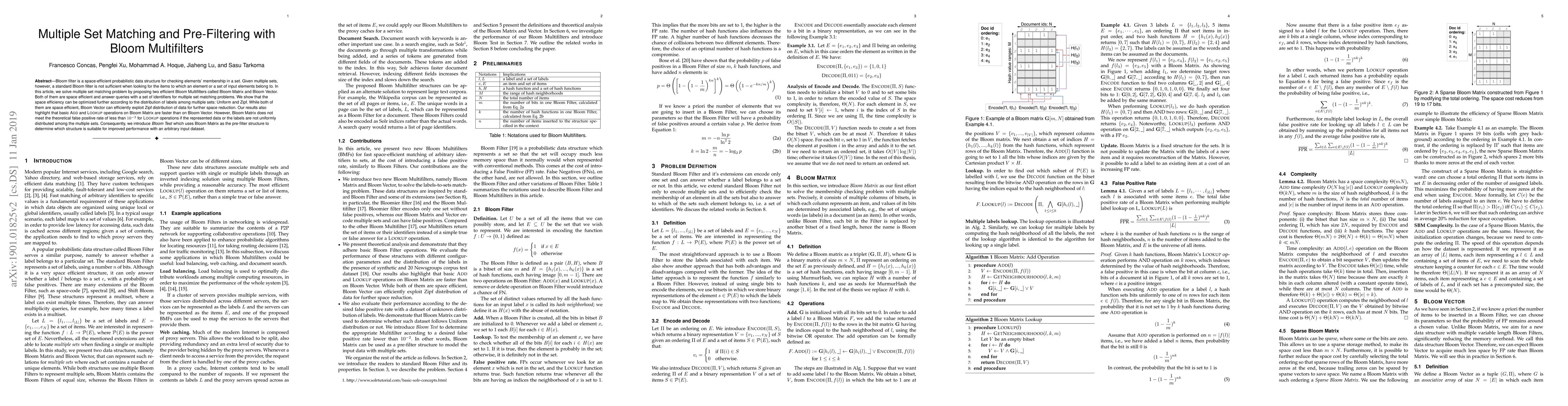 Bloom filter is a space-efficient probabilistic data structure for checking elements' membership in a set. Given multiple sets, however, a standard Bloom filter is not sufficient when looking for the items to which an element or a set of input elements belong to. In this article, we solve multiple set matching problem by proposing two efficient Bloom Multifilters called Bloom Matrix and Bloom Vector. Both of them are space efficient and answer queries with a set of identifiers for multiple set matching problems. We show that the space efficiency can be optimized further according to the distribution of labels among multiple sets: Uniform and Zipf. While both of them are space efficient, Bloom Vector can efficiently exploit Zipf distribution of data for further space reduction. Our results also highlight that basic ADD and LOOKUP operations on Bloom Matrix are faster than on Bloom Vector. However, Bloom Matrix does not meet the theoretical false positive rate of less than $10^{-2}$ for LOOKUP operations if the represented data or the labels are not uniformly distributed among the multiple sets. Consequently, we introduce \textit{Bloom Test} which uses Bloom Matrix as the pre-filter structure to determine which structure is suitable for improved performance with an arbitrary input dataset.