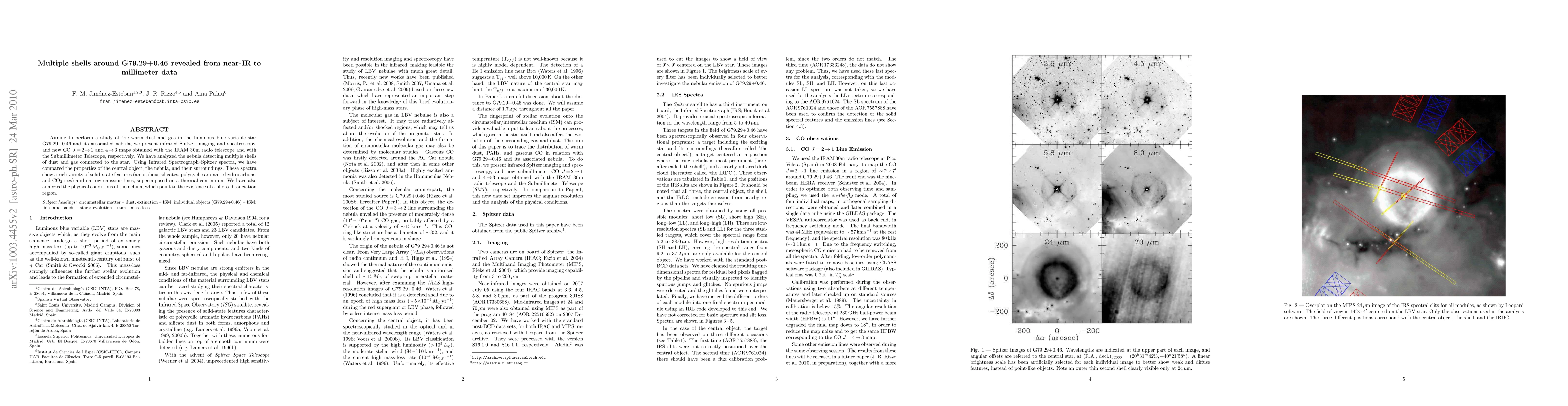 Aiming to perform a study of the warm dust and gas in the luminous blue variable star G79.29+0.46 and its associated nebula, we present infrared Spitzer imaging and spectroscopy, and new CO J=2-->1 and 4-->3 maps obtained with the IRAM 30m radio telescope and with the Submillimeter Telescope, respectively. We have analyzed the nebula detecting multiple shells of dust and gas connected to the star. Using Infrared Spectrograph-Spitzer spectra, we have compared the properties of the central object, the nebula, and their surroundings. These spectra show a rich variety of solid-state features (amorphous silicates, polycyclic aromatic hydrocarbons, and CO2 ices) and narrow emission lines, superimposed on a thermal continuum. We have also analyzed the physical conditions of the nebula, which point to the existence of a photo-dissociation region.