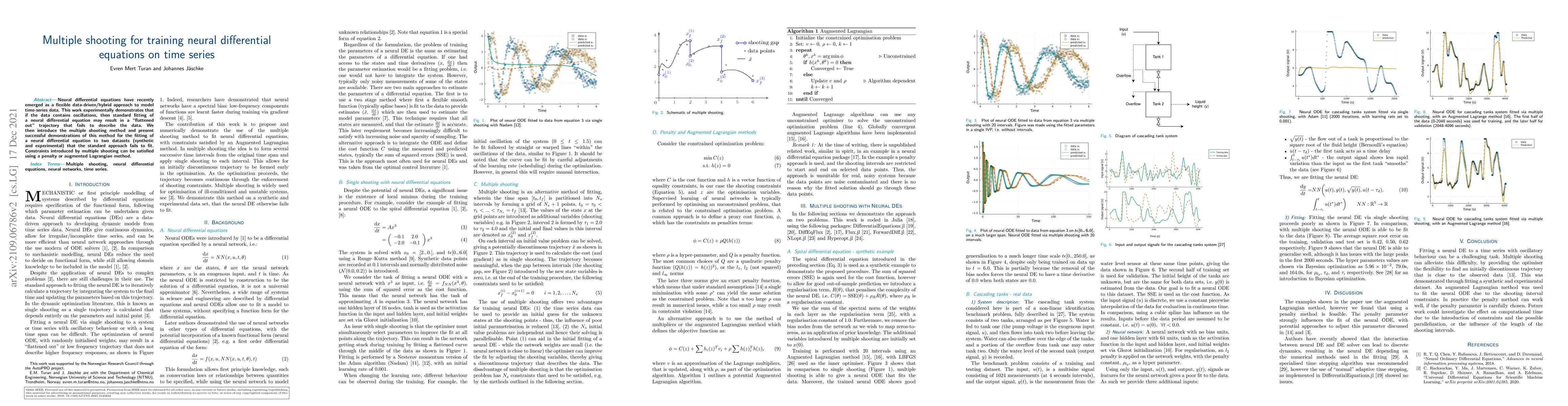 This paper introduces the multiple shooting method to improve the fitting of neural differential equations to time-series data, especially when oscillations are present. The standard fitting approach often fails, but the proposed method successfully fits two datasets, demonstrating its effectiveness.