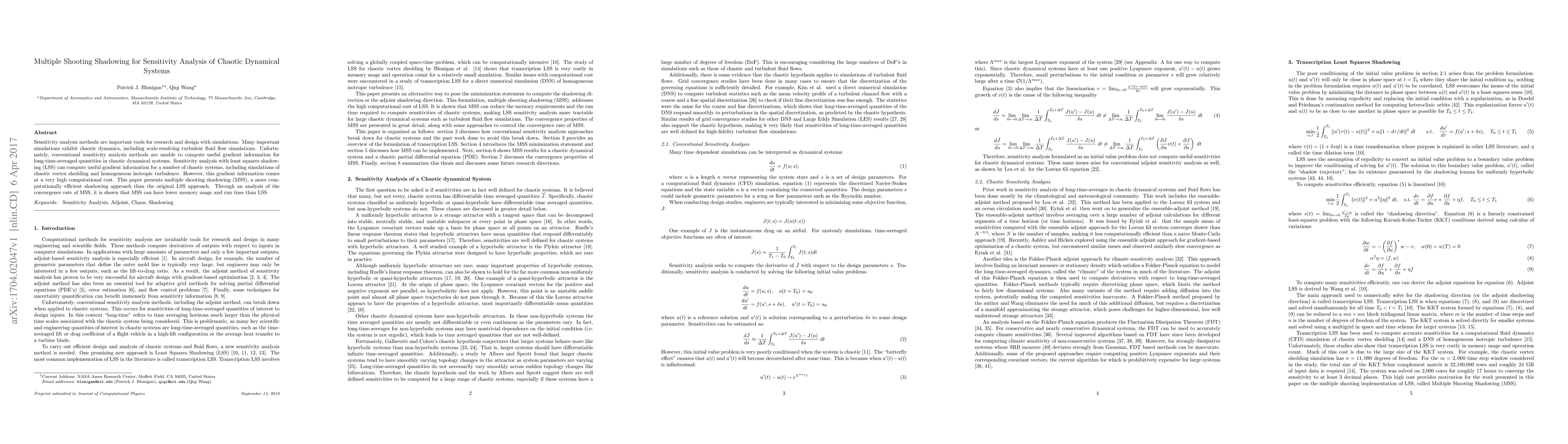 This paper introduces multiple shooting shadowing (MSS) as a more efficient alternative to least squares shadowing (LSS) for sensitivity analysis in chaotic dynamical systems, offering lower computational costs and improved convergence rates. MSS demonstrates reduced memory usage and faster runtime compared to LSS.