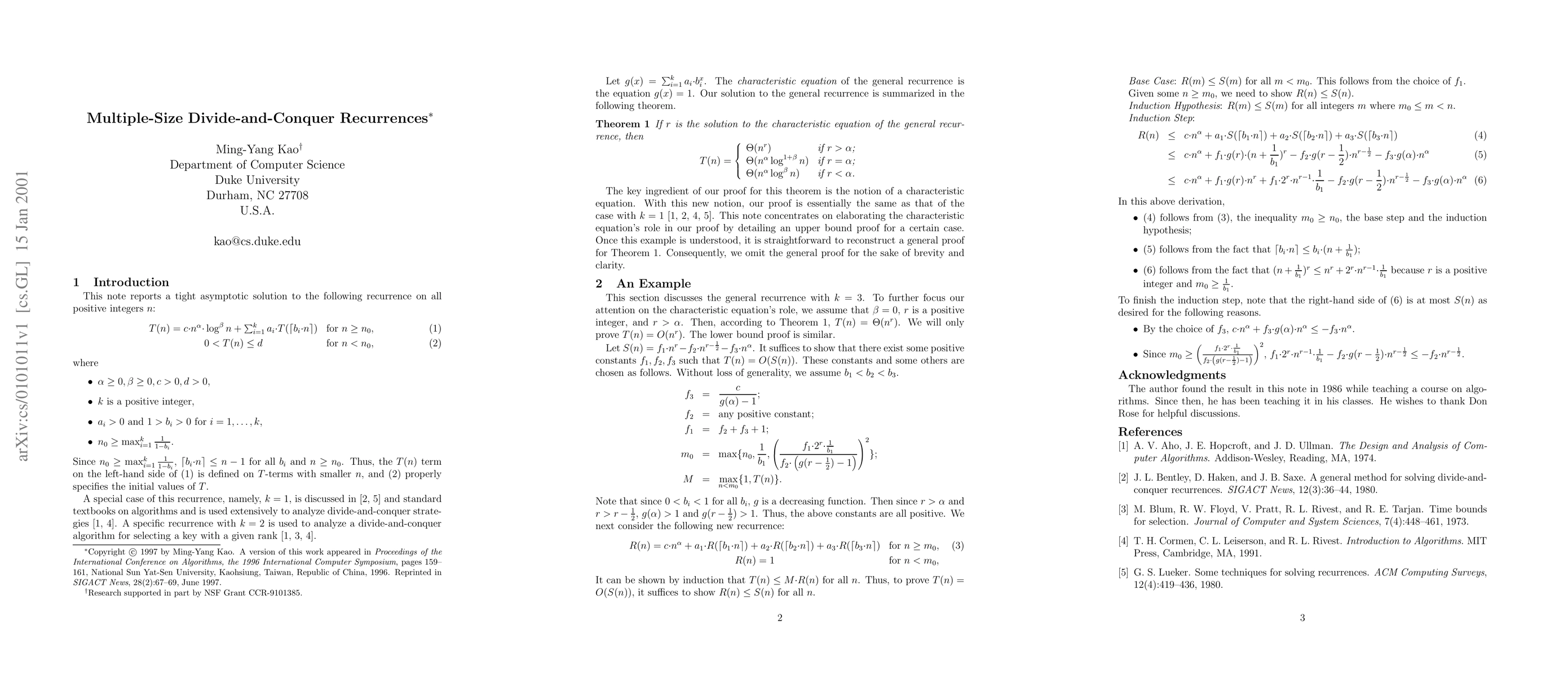 This paper presents a master theorem for solving multiple-size divide-and-conquer recurrences with more than one recursive term, providing tight asymptotic solutions for recurrences like T(n) = 1/4 T(n/16) + 1/3 T(3n/5) + 4 T(n/100) + 10 T(n/300) + n^2. The method extends traditional divide-and-conquer analysis to more complex recurrence forms.