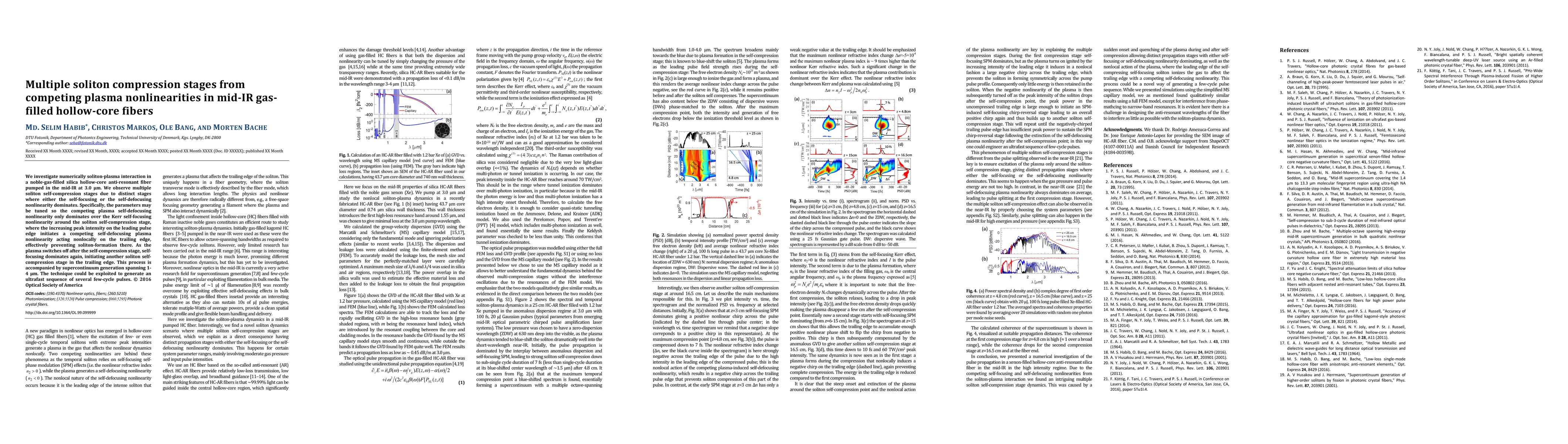 The paper presents a detailed numerical model of soliton-plasma interaction in mid-IR gas-filled hollow-core fibers, identifying multiple soliton self-compression stages due to competing nonlinearities.