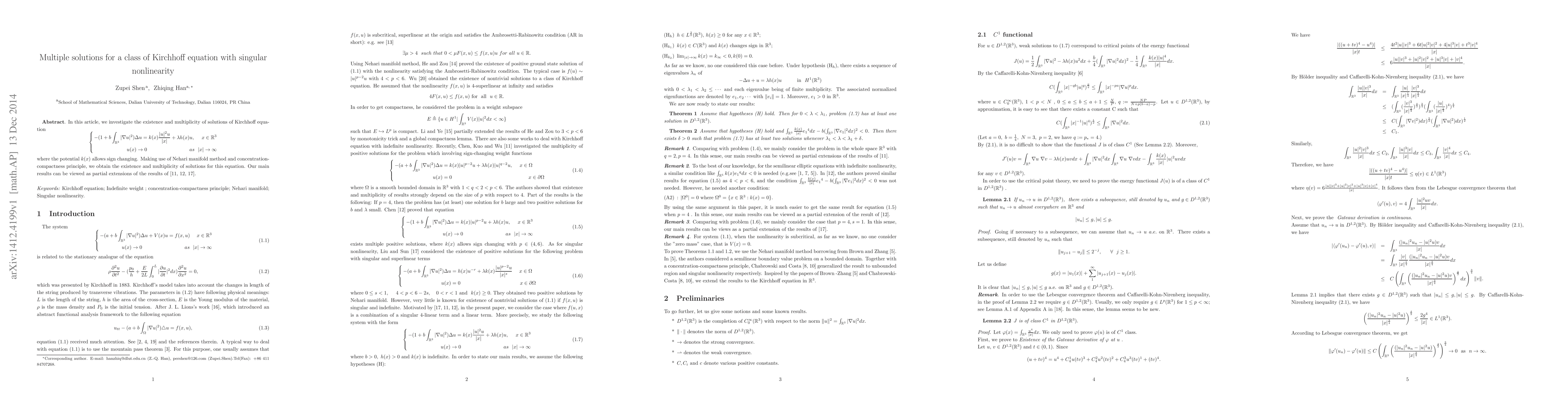 In this article, we investigate the existence and multiplicity of solutions of Kirchhoff equation \begin{equation*} \left\{ \begin{aligned} -(1+b \int_{\mathbb{R}^3}|\nabla u|^2)\Delta u= k(x)\frac{|u|^2 u}{|x|} +\lambda h(x)u,~~x\in\mathbb{R}^3\\ u(x)\rightarrow 0 ~~~~~~~~~~~~~~~~~~~~~~~as ~~~~|x|\rightarrow\infty \end{aligned} \right. \end{equation*} where the potential $k(x)$ allows sign changing. Making use of Nehari manifold method and Concentration-compactness principle, we obtain the existence and multiplicity of solutions for this equation.