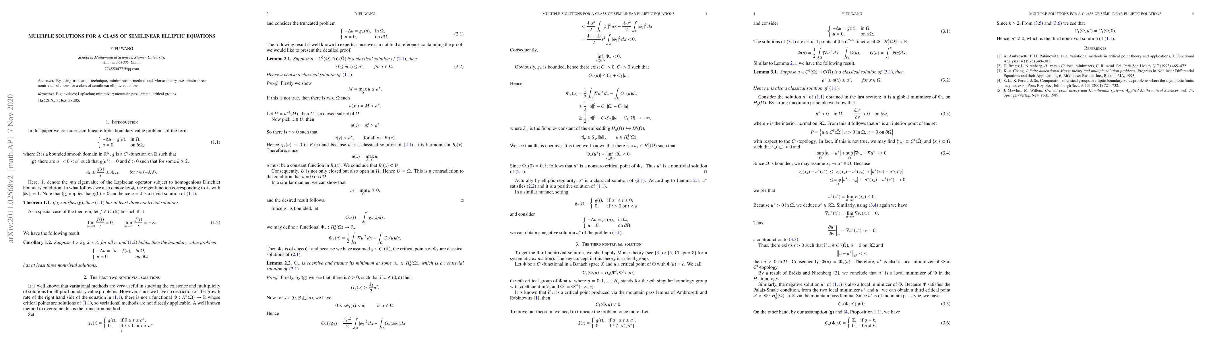 Summary: This paper utilizes truncation techniques, minimization methods, and Morse theory to demonstrate the existence of three nontrivial solutions for a class of semilinear elliptic equations. The approach combines analytical and topological methods to achieve the results.