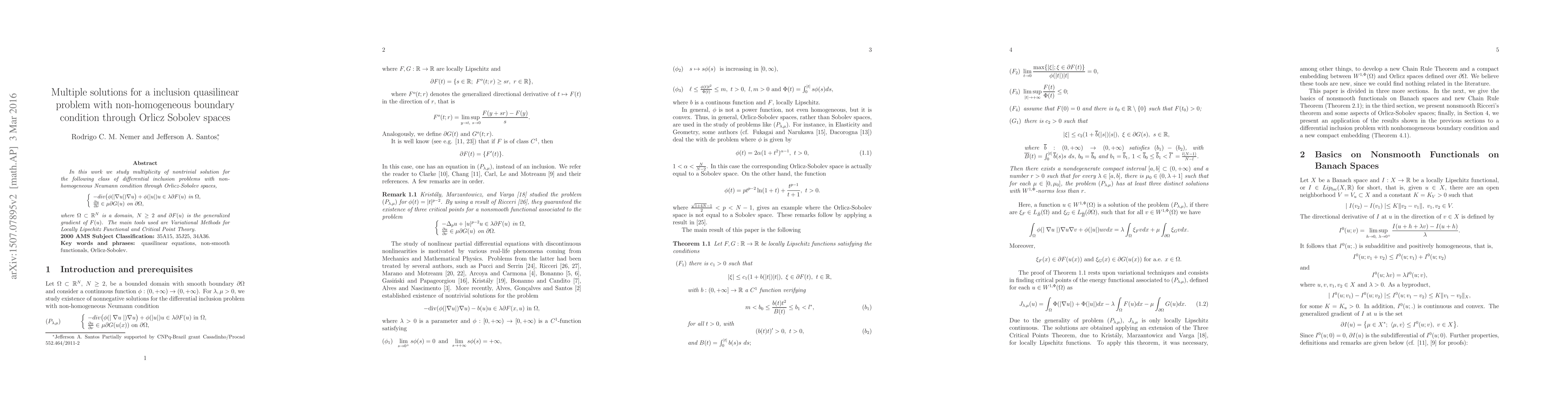 In this work we estend a recent result of Krist\'aly, Marzantowicz and Varga concerning the existence of three critical points certain non-smooth functionals. Using this result, we guarantee the existence of three solutions to a inclusion quasilinear problem, with non-homogeneous boundary condition through Orlicz Sobolev spaces.