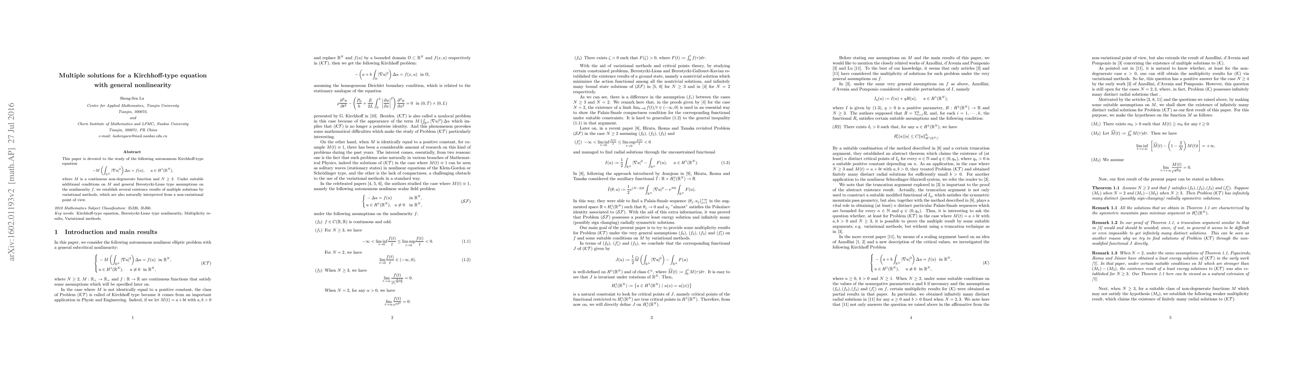 This paper investigates the existence of multiple solutions to a nonlinearity Kirchhoff-type equation with general nonlinearity, establishing existence results through variational methods.
