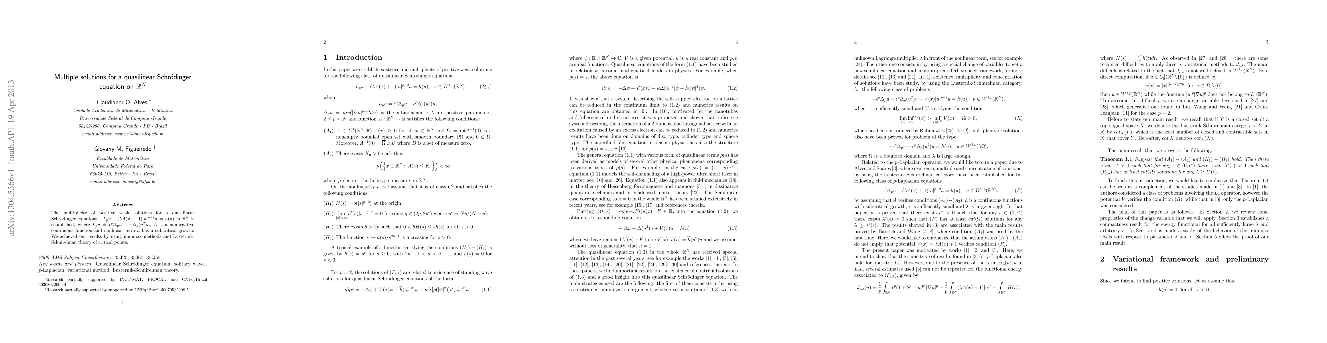 This paper establishes the existence of multiple positive weak solutions for a quasilinear Schrödinger equation in $\mathbb{R}^N$ using minimax methods and Lusternik-Schnirelman theory. The equation involves a $p$-Laplacian operator and a nonlinear term with subcritical growth.