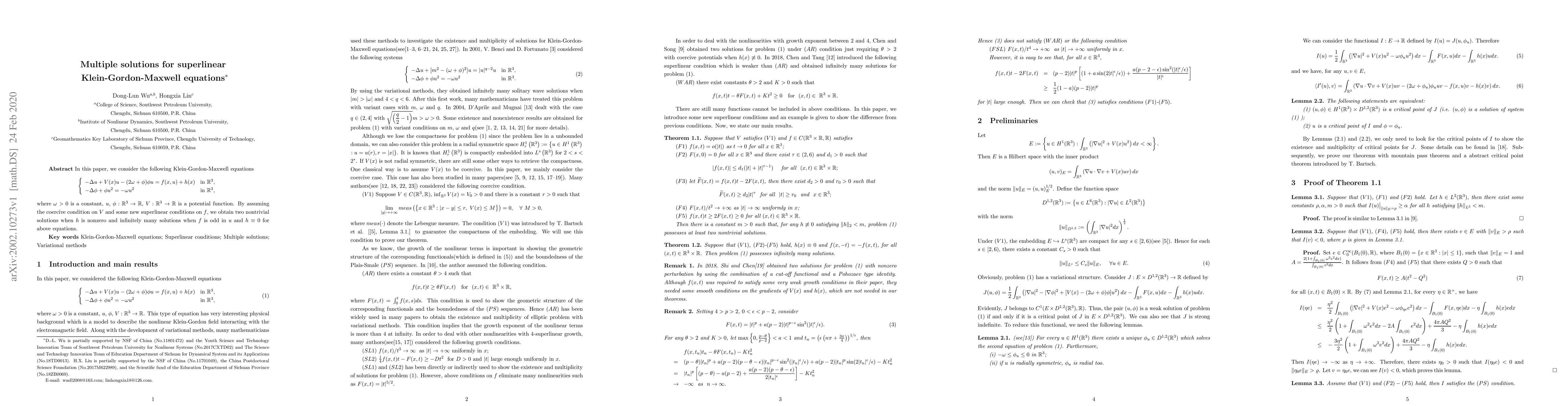 In this paper, we consider the following Klein-Gordon-Maxwell equations \begin{eqnarray*} \left\{ \begin{array}{ll} -\Delta u+ V(x)u-(2\omega+\phi)\phi u=f(x,u)+h(x)&\mbox{in $\mathbb{R}^{3}$},\\ -\Delta \phi+ \phi u^2=-\omega u^2&\mbox{in $\mathbb{R}^{3}$}, \end{array} \right. \end{eqnarray*} where $\omega>0$ is a constant, $u$, $\phi : \mathbb{R}^{3}\rightarrow \mathbb{R}$, $V : \mathbb{R}^{3} \rightarrow\mathbb{R}$ is a potential function. By assuming the coercive condition on $V$ and some new superlinear conditions on $f$, we obtain two nontrivial solutions when $h$ is nonzero and infinitely many solutions when $f$ is odd in $u$ and $h\equiv0$ for above equations.