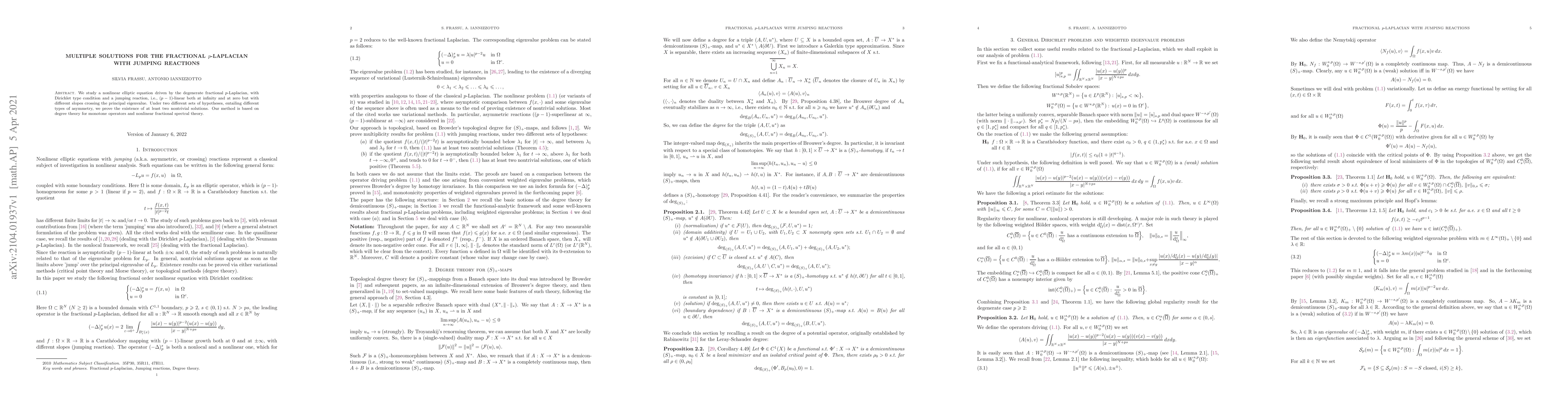 This paper investigates the existence of multiple nontrivial solutions for a nonlinear elliptic equation driven by a fractional p-Laplacian with a jumping reaction. Using degree theory and nonlinear fractional spectral theory, the authors prove the existence of at least two solutions under different sets of asymmetric hypotheses.