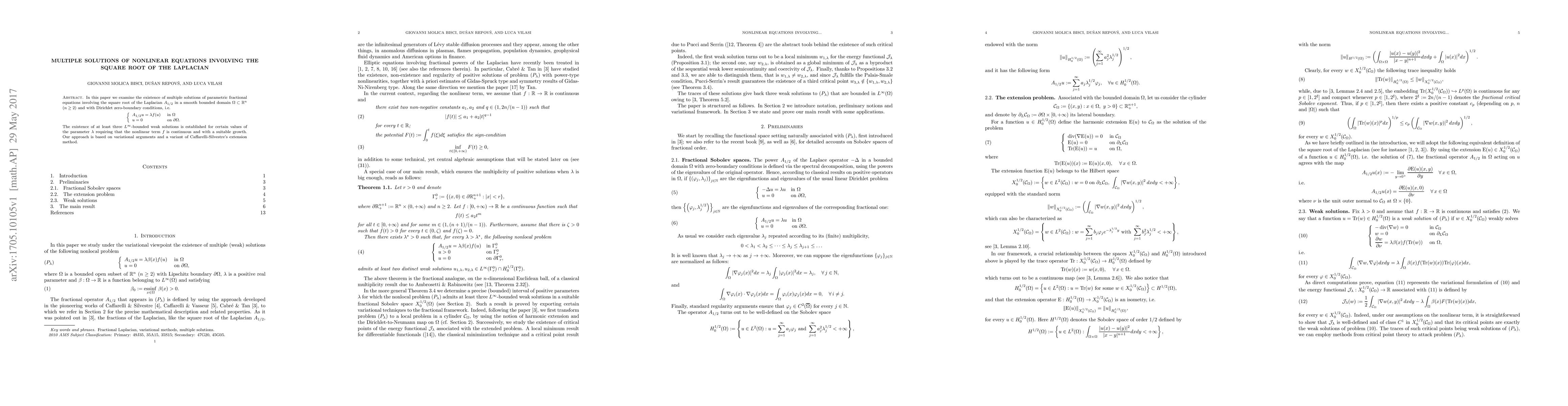 In this paper we examine the existence of multiple solutions of parametric fractional equations involving the square root of the Laplacian $A_{1/2}$ in a smooth bounded domain $\Omega\subset \mathbb{R}^n$ ($n\geq 2$) and with Dirichlet zero-boundary conditions, i.e. \begin{equation*} \left\{ \begin{array}{ll} A_{1/2}u=\lambda f(u) & \mbox{ in } \Omega\\ u=0 & \mbox{ on } \partial\Omega. \end{array}\right. \end{equation*} The existence of at least three $L^{\infty}$-bounded weak solutions is established for certain values of the parameter $\lambda$ requiring that the nonlinear term $f$ is continuous and with a suitable growth. Our approach is based on variational arguments and a variant of Caffarelli-Silvestre's extension method.