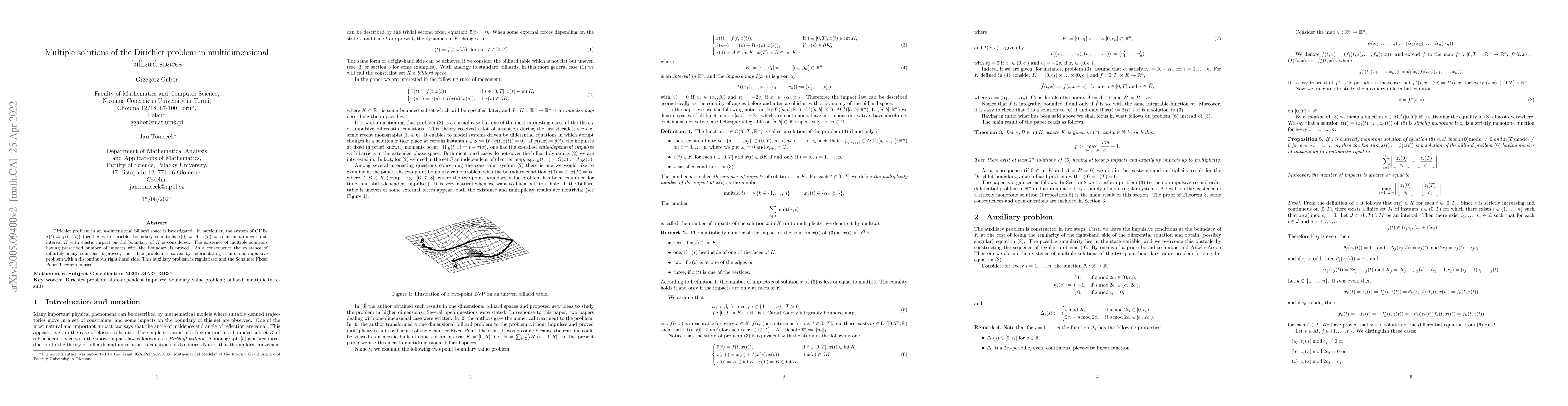 Dirichlet problem in an $n$-dimensional billiard space is investigated. In particular, the system of ODEs $\ddot x(t) = f(t,x(t))$ together with Dirichlet boundary conditions $x(0) = A$, $x(T) = B$ in an $n$-dimensional interval $K$ with elastic impact on the boundary of $K$ is considered. The existence of multiple solutions having prescribed number of impacts with the boundary is proved. As a consequence the existence of infinitely many solutions is proved, too. The problem is solved by reformulation it into non-impulsive problem with a discontinuous right-hand side. This auxiliary problem is regularized and the Schauder Fixed Point Theorem is used.