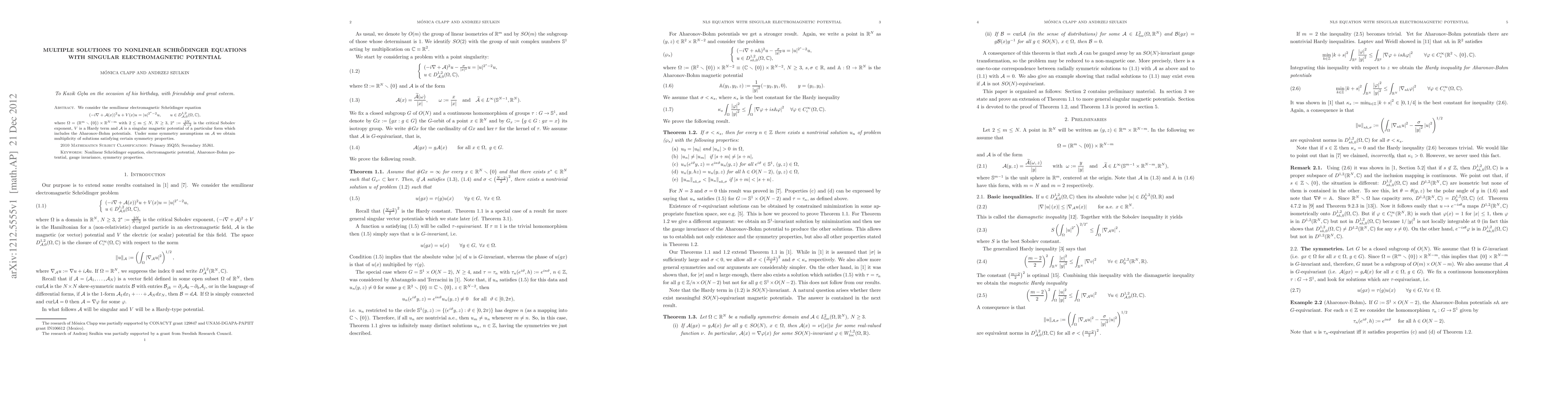 This paper investigates the semilinear electromagnetic Schrödinger equation with singular magnetic potentials, including the Aharonov-Bohm potentials, and proves the existence of multiple solutions under symmetry assumptions, utilizing the critical Sobolev exponent and Hardy term considerations.