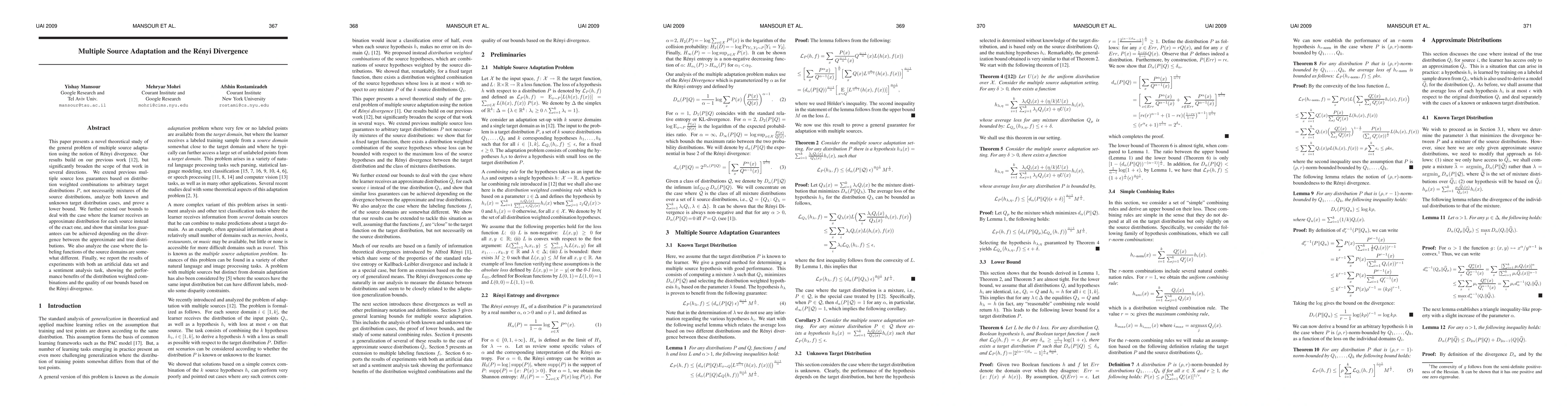This paper extends multiple source adaptation theory using Renyi divergence, providing loss guarantees for arbitrary target distributions and analyzing approximate distributions and differing labeling functions. Experiments demonstrate the effectiveness of distribution weighted combinations in both synthetic and real-world sentiment analysis tasks.