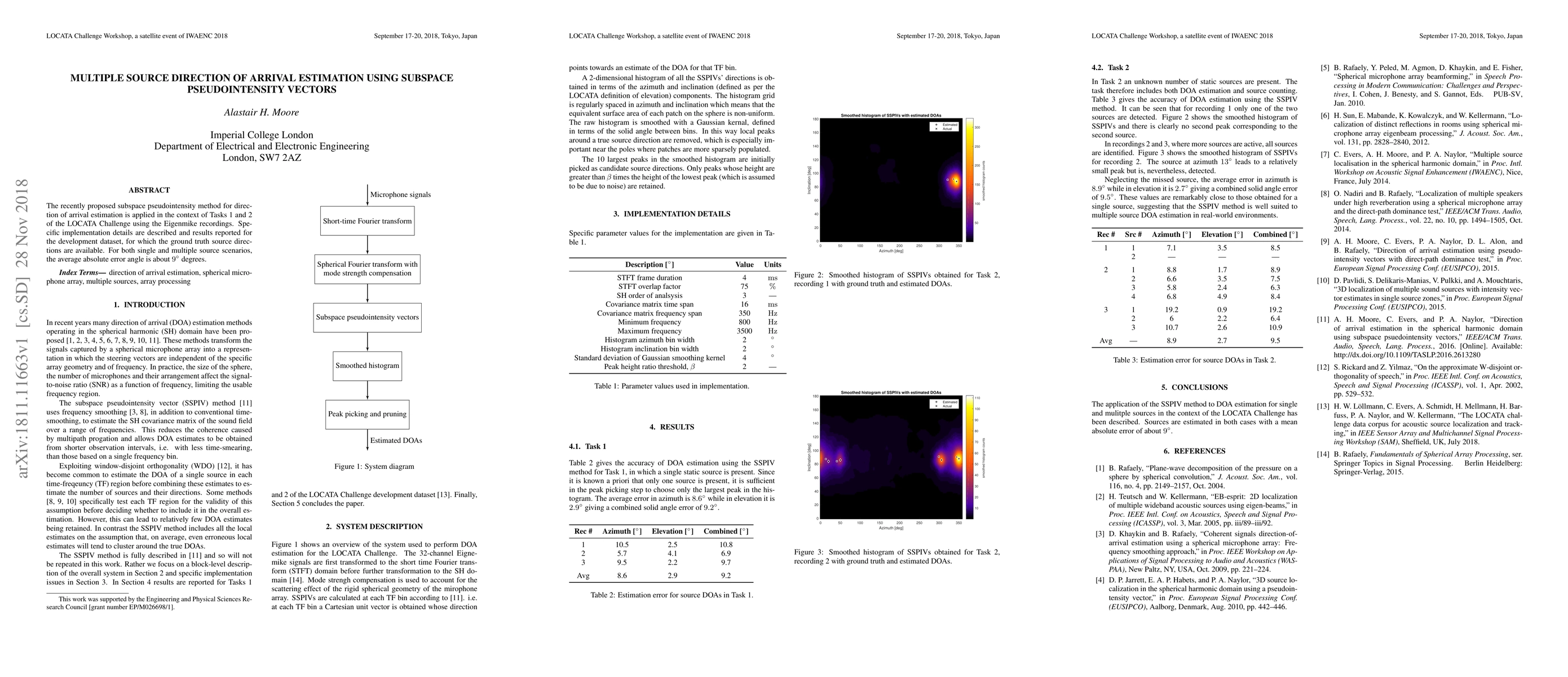 The paper applies the subspace pseudointensity method for direction of arrival estimation to the LOCATA Challenge datasets, achieving an average absolute error angle of approximately 9 degrees for both single and multiple source scenarios. The method's performance is validated using Eigenmike recordings and the development dataset with known ground truth source directions.