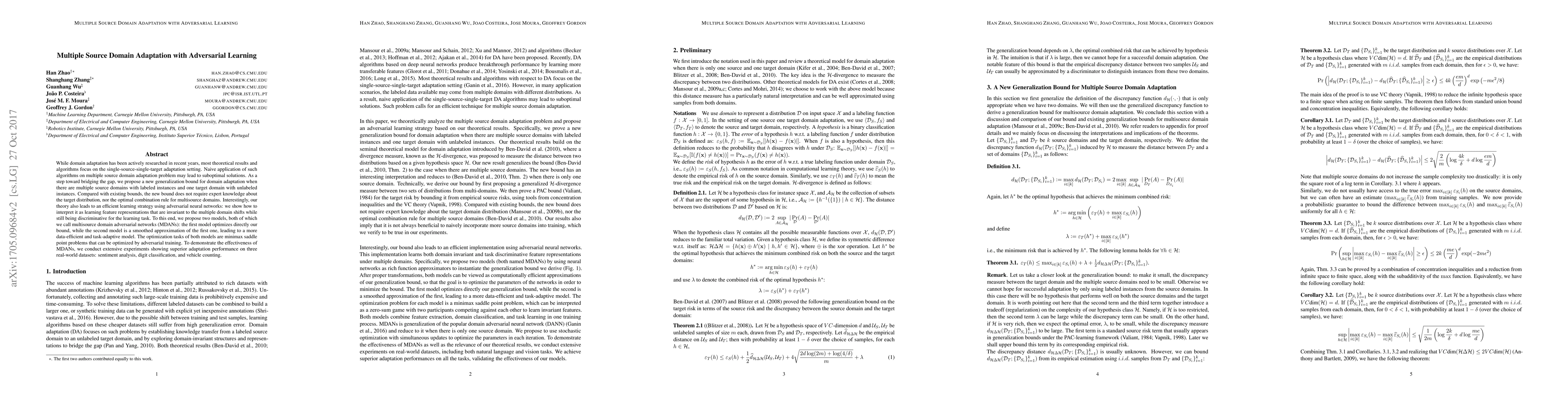This paper proposes a new theoretical bound for multiple source domain adaptation and introduces two adversarial neural network models, MDANs, to effectively learn invariant features across multiple source domains. Experiments demonstrate superior adaptation performance on sentiment analysis, digit classification, and vehicle counting datasets.