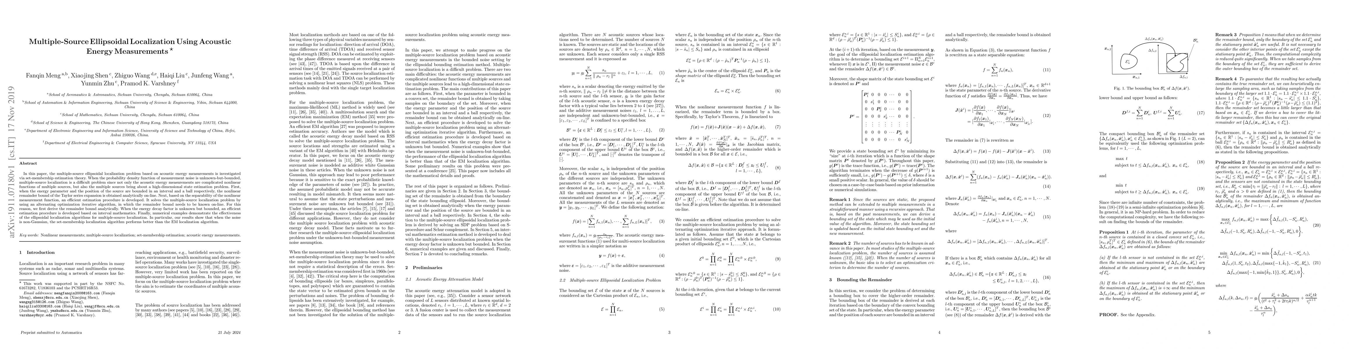 In this paper, the multiple-source ellipsoidal localization problem based on acoustic energy measurements is investigated via set-membership estimation theory. When the probability density function of measurement noise is unknown-but-bounded, multiple-source localization is a difficult problem since not only the acoustic energy measurements are complicated nonlinear functions of multiple sources, but also the multiple sources bring about a high-dimensional state estimation problem. First, when the energy parameter and the position of the source are bounded in an interval and a ball respectively, the nonlinear remainder bound of the Taylor series expansion is obtained analytically on-line. Next, based on the separability of the nonlinear measurement function, an efficient estimation procedure is developed. It solves the multiple-source localization problem by using an alternating optimization iterative algorithm, in which the remainder bound needs to be known on-line. For this reason, we first derive the remainder bound analytically. When the energy decay factor is unknown but bounded, an efficient estimation procedure is developed based on interval mathematics. Finally, numerical examples demonstrate the effectiveness of the ellipsoidal localization algorithms for multiple-source localization. In particular, our results show that when the noise is non-Gaussian, the set-membership localization algorithm performs better than the EM localization algorithm.