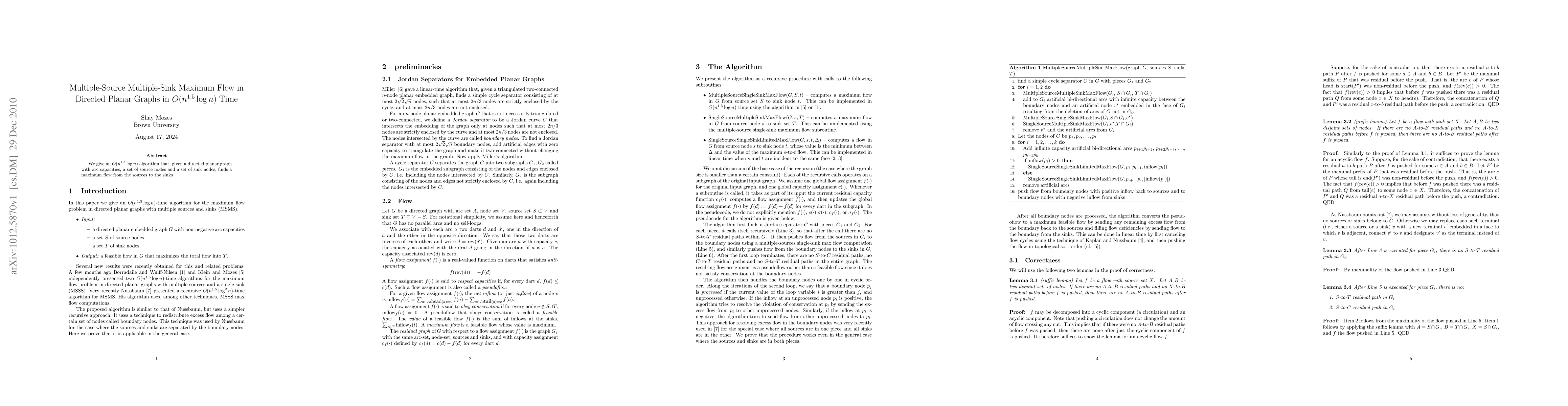 Summary: This paper presents an efficient $O(n^{1.5} \log n)$ algorithm for finding the maximum flow in directed planar graphs with multiple source and sink nodes, leveraging the graph's planar nature for optimization.