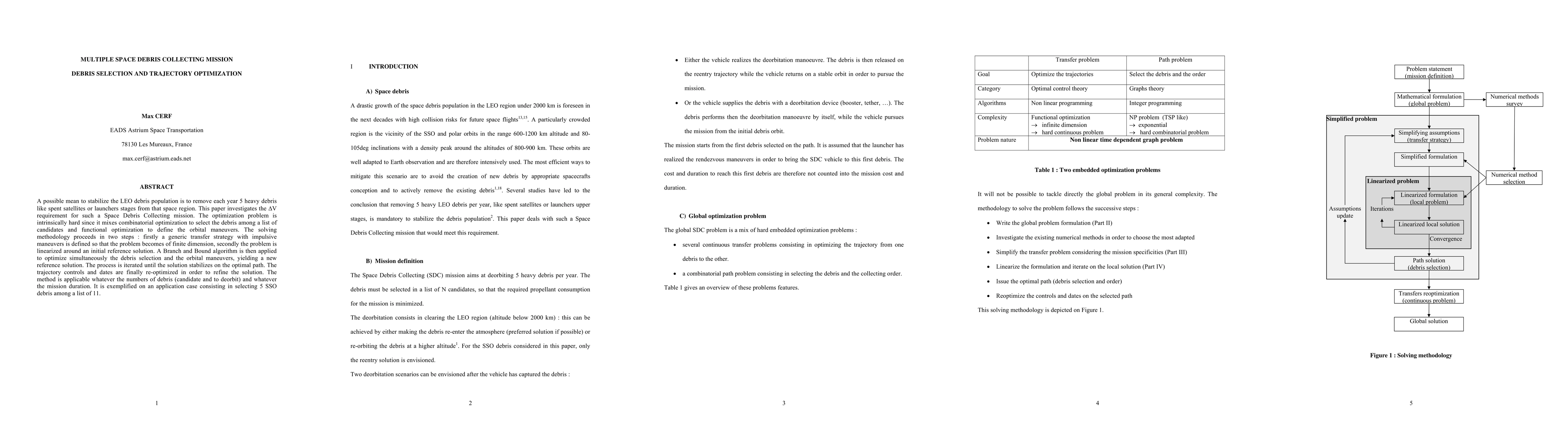 A possible mean to stabilize the LEO debris population is to remove each year 5 heavy debris like spent satellites or launchers stages from that space region. This paper investigates the DeltaV requirement for such a Space Debris Collecting mission. The optimization problem is intrinsically hard since it mixes combinatorial optimization to select the debris among a list of candidates and functional optimization to define the orbital maneuvers. The solving methodology proceeds in two steps : firstly a generic transfer strategy with impulsive maneuvers is defined so that the problem becomes of finite dimension, secondly the problem is linearized around an initial reference solution. A Branch and Bound algorithm is then applied to optimize simultaneously the debris selection and the orbital maneuvers, yielding a new reference solution. The process is iterated until the solution stabilizes on the optimal path. The trajectory controls and dates are finally re-optimized in order to refine the solution. The method is applicable whatever the numbers of debris (candidate and to deorbit) and whatever the mission duration. It is exemplified on an application case consisting in selecting 5 SSO debris among a list of 11.