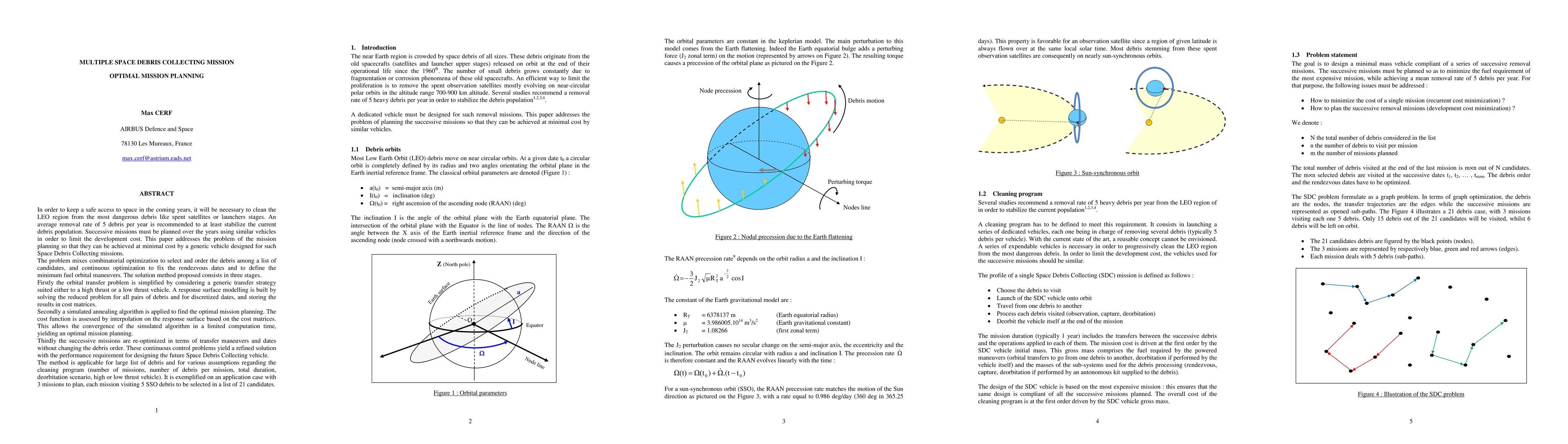 This paper proposes a three-stage method for planning cost-effective successive space debris collecting missions, combining combinatorial optimization and continuous optimization. It uses response surface modeling and simulated annealing for efficient computation and refinement of mission plans.