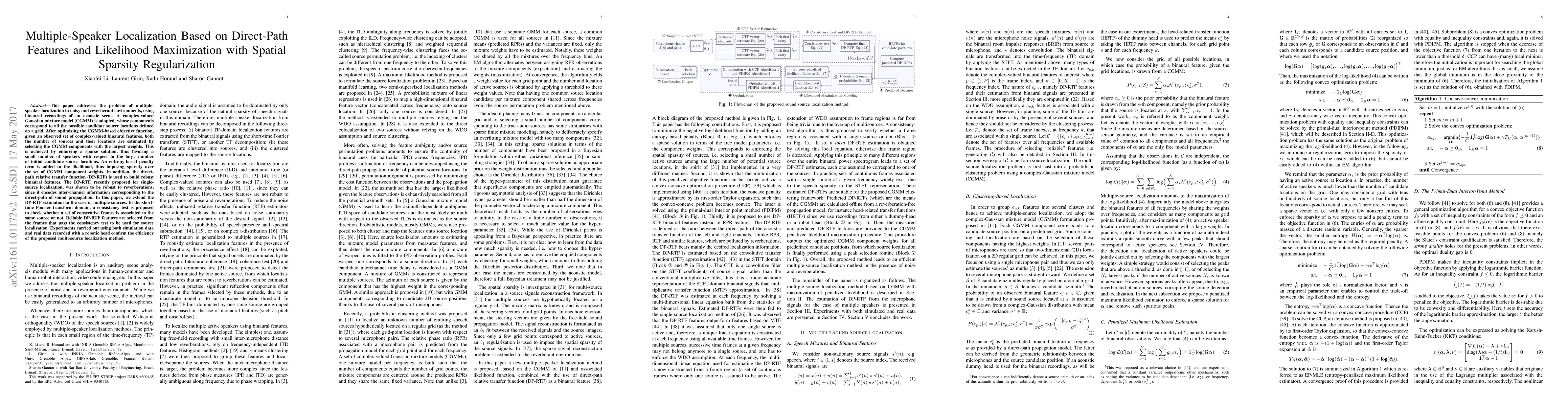 This paper addresses the problem of multiple-speaker localization in noisy and reverberant environments, using binaural recordings of an acoustic scene. A Gaussian mixture model (GMM) is adopted, whose components correspond to all the possible candidate source locations defined on a grid. After optimizing the GMM-based objective function, given an observed set of binaural features, both the number of sources and their locations are estimated by selecting the GMM components with the largest priors. This is achieved by enforcing a sparse solution, thus favoring a small number of speakers with respect to the large number of initial candidate source locations. An entropy-based penalty term is added to the likelihood, thus imposing sparsity over the set of GMM priors. In addition, the direct-path relative transfer function (DP-RTF) is used to build robust binaural features. The DP-RTF, recently proposed for single-source localization, was shown to be robust to reverberations, since it encodes inter-channel information corresponding to the direct-path of sound propagation. In this paper, we extend the DP-RTF estimation to the case of multiple sources. In the short-time Fourier transform domain, a consistency test is proposed to check whether a set of consecutive frames is associated to the same source or not. Reliable DP-RTF features are selected from the frames that pass the consistency test to be used for source localization. Experiments carried out using both simulation data and real data gathered with a robotic head confirm the efficiency of the proposed multi-source localization method.