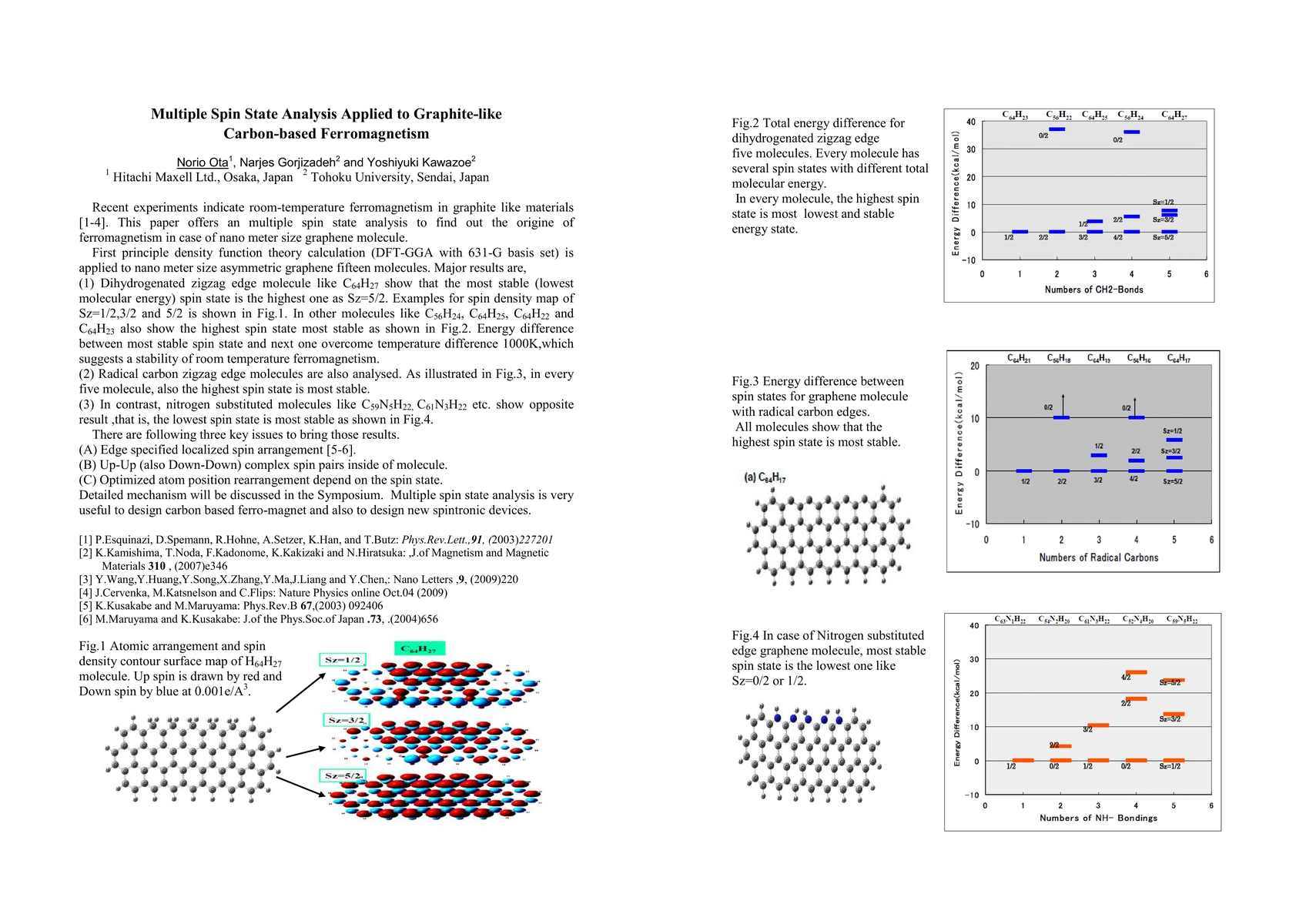 Recent experiments indicate room-temperature ferromagnetism in graphite like materials. This paper offers an multiple spin state analysis to find out the origine of ferromagnetism in case of nano meter size graphene molecule.First principle density function theory calculation (DFT-GGA with 631-G basis set) is applied to nano meter size asymmetric graphene fifteen molecules. Major results are,(1) Dihydrogenated zigzag edge molecule like C64H27 show that the most stable (lowest molecular energy) spin state is the highest one as Sz=5/2. Examples for spin density map of Sz=1/2,3/2 and 5/2 is shown in Fig.1. In other molecules like C56H24, C64H25, C64H22 and C64H23 also show the highest spin state most stable as shown in Fig.2. Energy difference between most stable spin state and next one overcome temperature difference 1000K,which suggests a stability of room temperature ferromagnetism. (2) Radical carbon zigzag edge molecules are also analysed. As illustrated in Fig.3, in every five molecule, also the highest spin state is most stable. (3) In contrast, nitrogen substituted molecules like C59N5H22, C61N3H22 etc. show opposite result,that is, the lowest spin state is most stable as shown in Fig.4. There are following three key issues to bring those results. (A) Edge specified localized spin arrangement. (B) Up-Up (also Down-Down) complex spin pairs inside of molecule. (C) Optimized atom position rearrangement depend on the spin state. Detailed mechanism will be discussed in the Symposium. Multiple spin state analysis is very useful to design carbon based ferro-magnet and also to design new spintronic devices.
