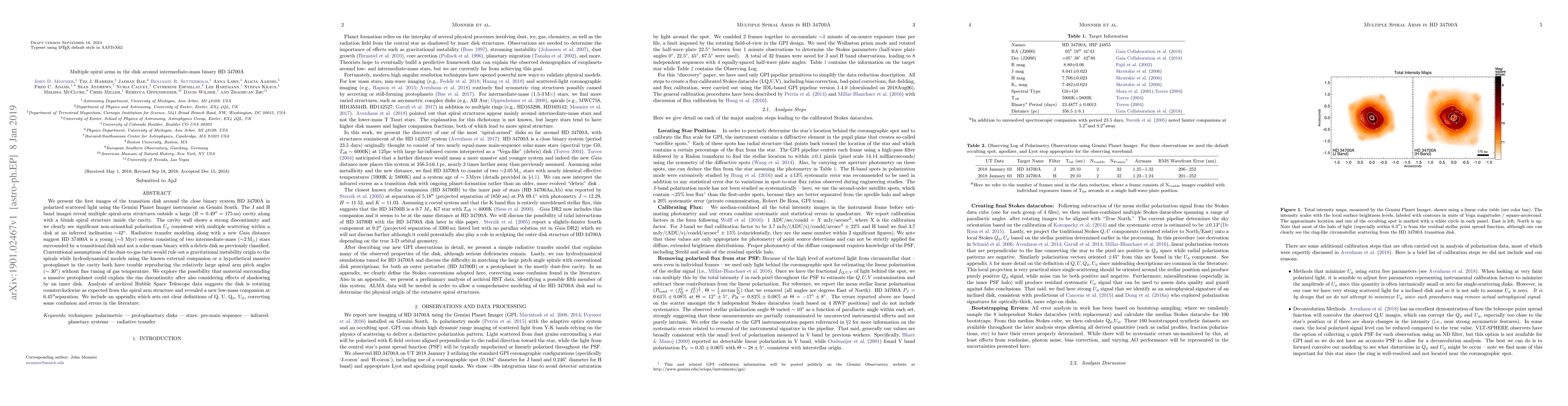 The paper presents the first images of the transition disk around the binary system HD 34700A, revealing multiple spiral arms in polarized light. The study suggests these spirals may originate from a massive protoplanet or disk effects, challenging conventional instability models. The system is confirmed to host intermediate-mass stars (~2Msun) and a young disk, with a new low-mass companion discovered.