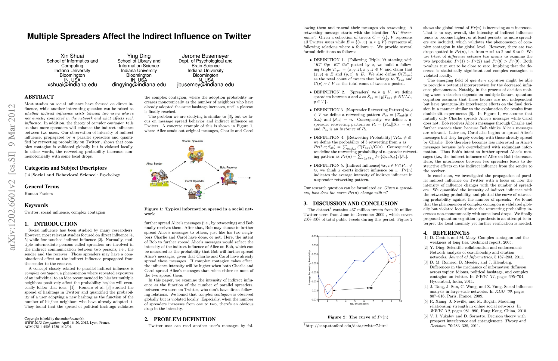 Most studies on social influence have focused on direct influence, while another interesting question can be raised as whether indirect influence exists between two users who're not directly connected in the network and what affects such influence. In addition, the theory of \emph{complex contagion} tells us that more spreaders will enhance the indirect influence between two users. Our observation of intensity of indirect influence, propagated by $n$ parallel spreaders and quantified by retweeting probability on Twitter, shows that complex contagion is validated globally but is violated locally. In other words, the retweeting probability increases non-monotonically with some local drops.