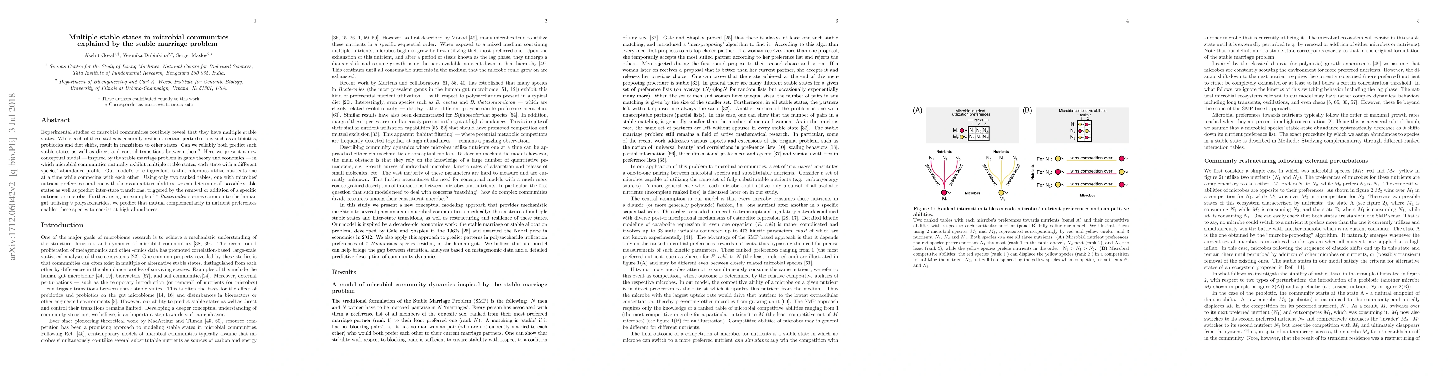 A new model explains how microbial communities can exist in multiple stable states, predicting transitions based on nutrient competition and preferences. The model shows that complementary nutrient needs enable certain species to coexist at high abundances.
