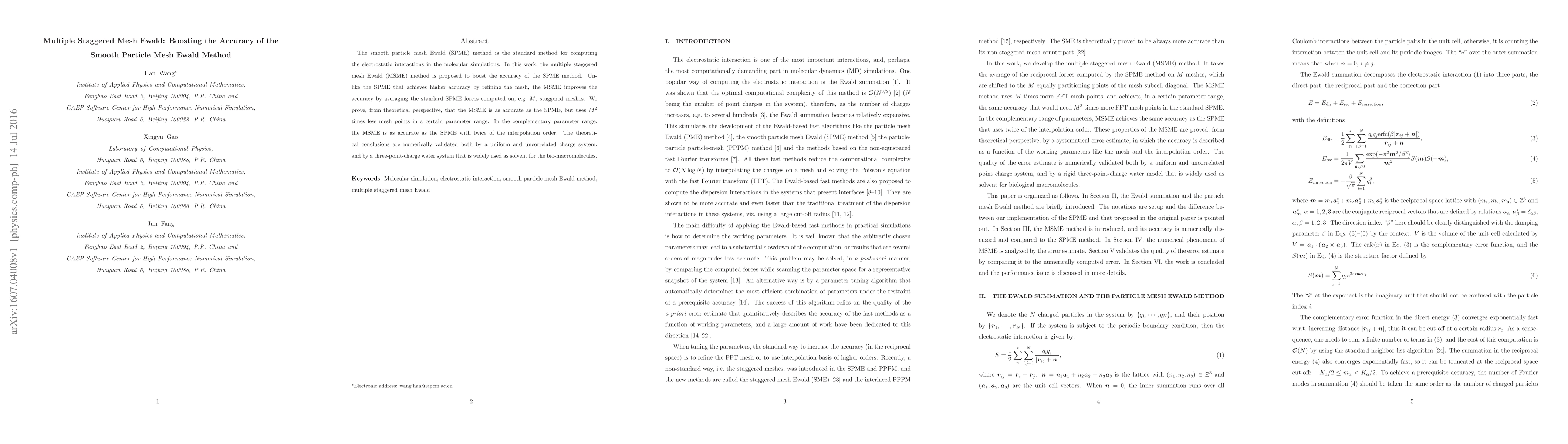 The paper proposes the multiple staggered mesh Ewald (MSME) method to enhance the accuracy of the smooth particle mesh Ewald (SPME) method, achieving similar accuracy with significantly fewer mesh points or higher interpolation order. Theoretical and numerical validations confirm the method's effectiveness.