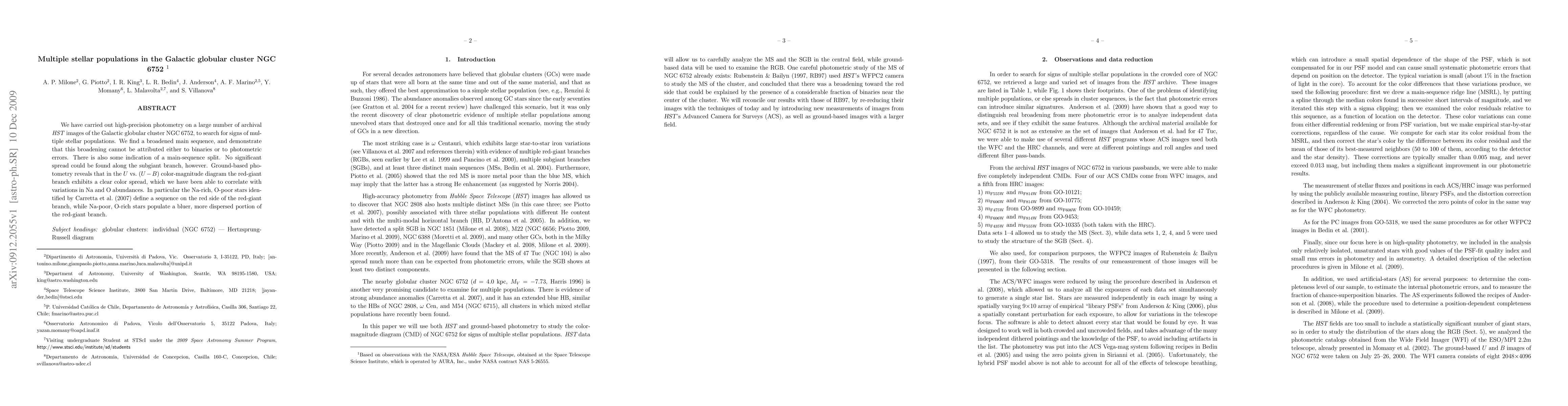 This study uses high-precision HST photometry to reveal multiple stellar populations in NGC 6752, evidenced by a broadened main sequence and a split in the red-giant branch correlating with Na and O abundance variations. No significant spread is observed along the subgiant branch.
