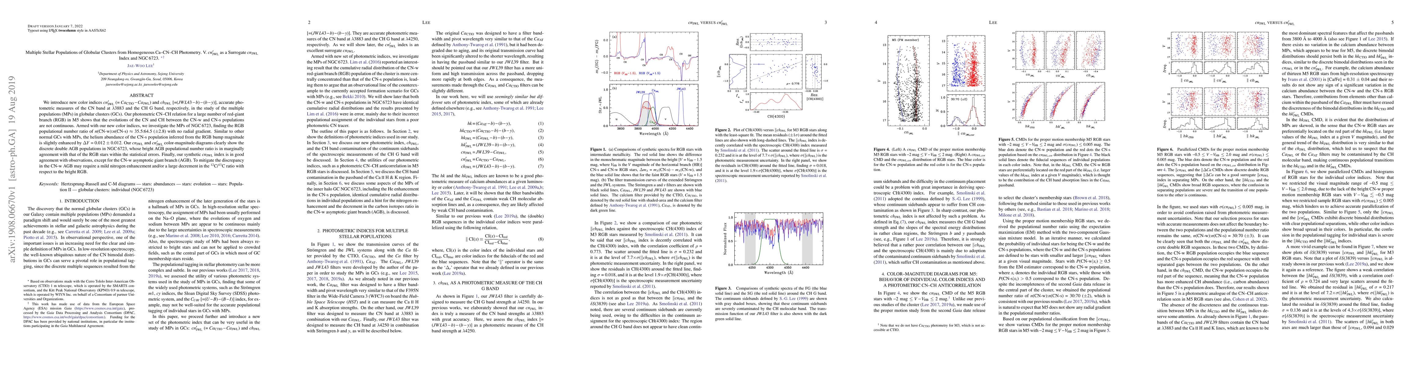 We introduce new color indices $cn^\prime_{\rm JWL}$ (= $Ca_{\rm CTIO} - Ca_{\rm JWL}$) and $ch_{\rm JWL}$ [=$(JWL43 - b) - (b-y)$], accurate photometric measures of the CN band at $\lambda$3883 and the CH G band, respectively, in the study of the multiple populations (MPs) in globular clusters (GCs). Our photometric CN--CH relation for a large number of red-giant branch (RGB) in M5 shows that the evolutions of the CN and CH between the CN-w and CN-s populations are not continuous. Armed with our new color indices, we investigate the MPs of NGC 6723, finding the RGB populational number ratio of $n$(CN-w):$n$(CN-s) $\approx$ 35.5:64.5 ($\pm$2.8) with no radial gradient. Similar to other normal GCs with MPs, the helium abundance of the CN-s population inferred from the RGB bump magnitude is slightly enhanced by $\Delta Y$ = 0.012 $\pm$ 0.012. Our $cn_{\rm JWL}$ and $cn^\prime_{\rm JWL}$ color-magnitude diagrams clearly show the discrete double AGB populations in NGC 6723, whose bright AGB populational number ratio is in marginally agreement with that of the RGB stars within the statistical errors. Finally, our synthetic $cn_{\rm JWL}$ index is in good agreement with observations, except for the CN-w asymptotic giant branch (AGB). To mitigate the discrepancy in the CN-w AGB may require a mild nitrogen enhancement and/or a large decrement in the $^{12}$C/$^{13}$C ratio with respect to the bright RGB.