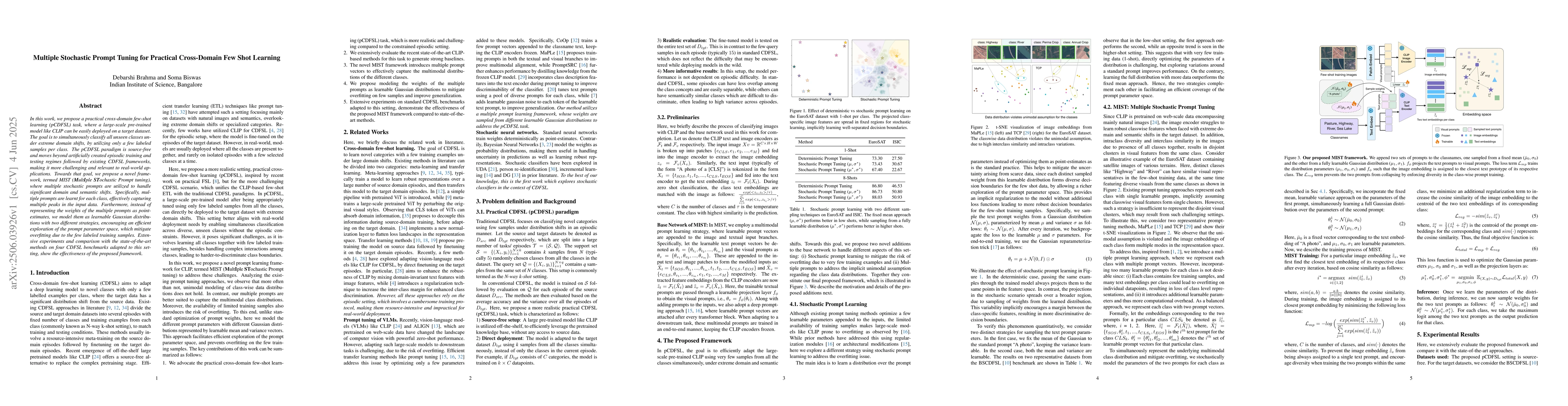 The research proposes a practical cross-domain few-shot learning (pCDFSL) task, utilizing large-scale pre-trained models like CLIP with only a few labeled samples per class under extreme domain shifts. It introduces MIST (MultIple STochastic Prompt tuning), which employs multiple stochastic prompts to capture multiple peaks in input data, modeled as learnable Gaussian distributions to efficiently explore the prompt parameter space and mitigate overfitting.