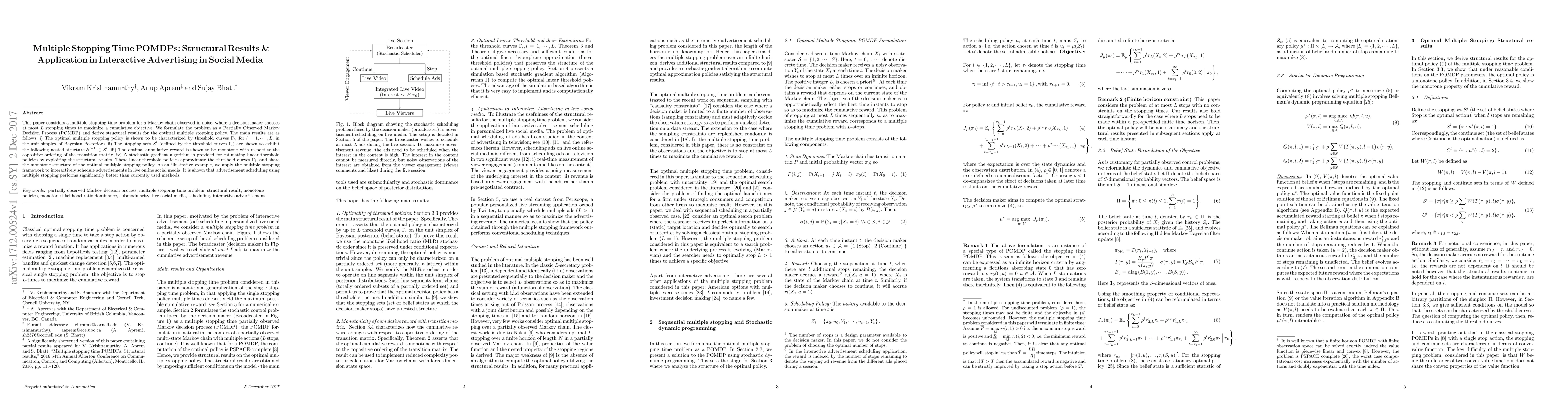 This paper considers a multiple stopping time problem for a Markov chain observed in noise, where a decision maker chooses at most L stopping times to maximize a cumulative objective. We formulate the problem as a Partially Observed Markov Decision Process (POMDP) and derive structural results for the optimal multiple stopping policy. The main results are as follows: i) The optimal multiple stopping policy is shown to be characterized by threshold curves in the unit simplex of Bayesian Posteriors. ii) The stopping setsl (defined by the threshold curves) are shown to exhibit a nested structure. iii) The optimal cumulative reward is shown to be monotone with respect to the copositive ordering of the transition matrix. iv) A stochastic gradient algorithm is provided for estimating linear threshold policies by exploiting the structural results. These linear threshold policies approximate the threshold curves, and share the monotone structure of the optimal multiple stopping policy. As an illustrative example, we apply the multiple stopping framework to interactively schedule advertisements in live online social media. It is shown that advertisement scheduling using multiple stopping performs significantly better than currently used methods.