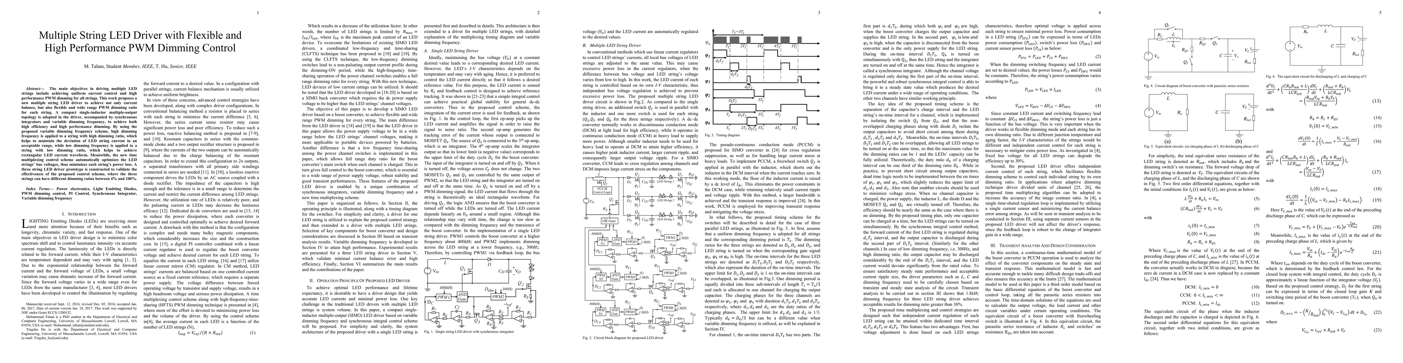 The main objectives in driving multiple LED strings include achieving uniform current control and high performance PWM dimming for all strings. This work proposes a new multiple string LED driver to achieve not only current balance, but also flexible and wide range PWM dimming ratio for each string. A compact single-inductor multiple-output topology is adopted in the driver, accompanied by synchronous integrators and variable dimming frequency, to achieve both high efficiency and high performance dimming. By using the proposed variable dimming frequency scheme, high dimming frequency is applied to a string with high dimming ratio, which helps to maintain the deviation of LED string current in an acceptable range, while low dimming frequency is applied to a string with low dimming ratio, which helps to achieve rectangular LED current waveform. Meanwhile, the new time multiplexing control scheme automatically optimizes the LED string's bus voltages, thus minimizes each string's power loss. A three string LED driver prototype is constructed to validate the effectiveness of the peoposed control scheme, where the three strings can have different dimming ratios between 4% and 100%.