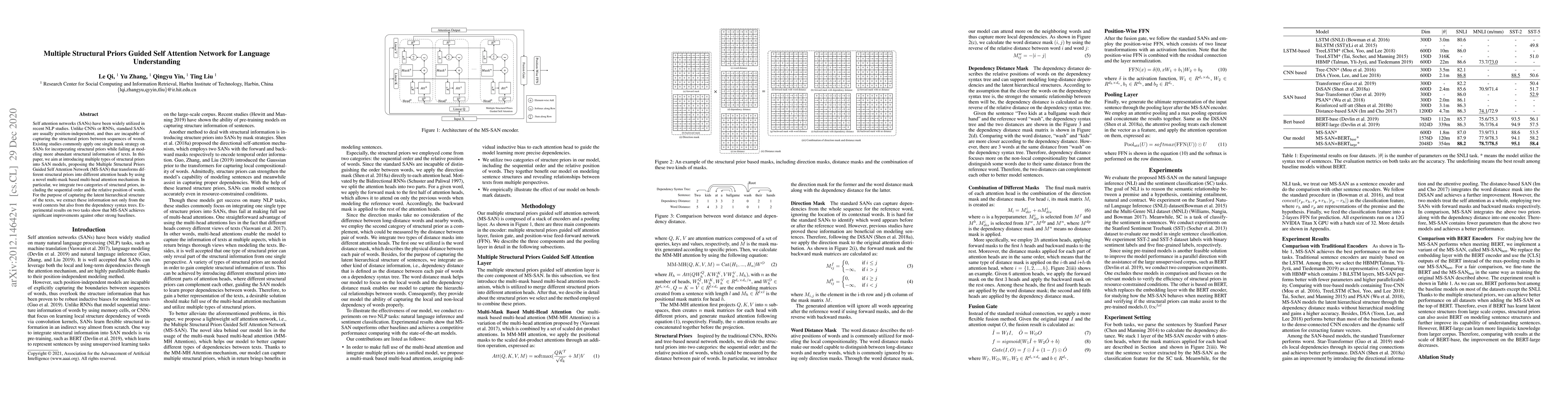 This paper proposes the Multiple Structural Priors Guided Self Attention Network (MS-SAN) to enhance self-attention networks by incorporating multiple structural priors, including sequential order and relative word positions, through a multi-mask based multi-head attention mechanism. Experimental results demonstrate significant improvements over other baselines in language understanding tasks.
