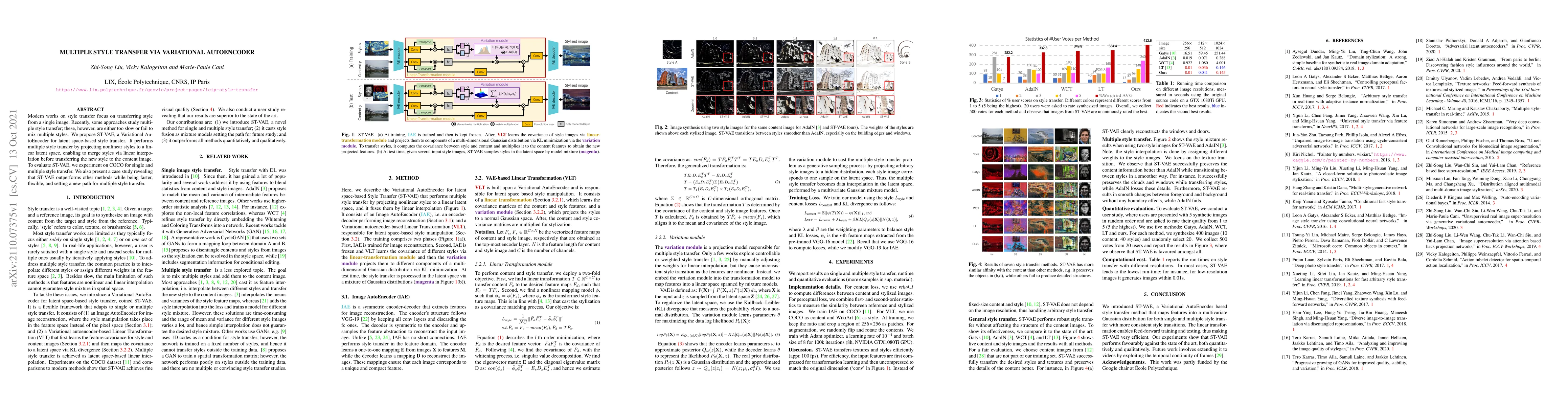 The paper proposes ST-VAE, a Variational AutoEncoder for efficient multiple style transfer, which projects nonlinear styles into a linear latent space for flexible style interpolation and transfer. Experiments on COCO show that ST-VAE outperforms existing methods in terms of speed and flexibility.