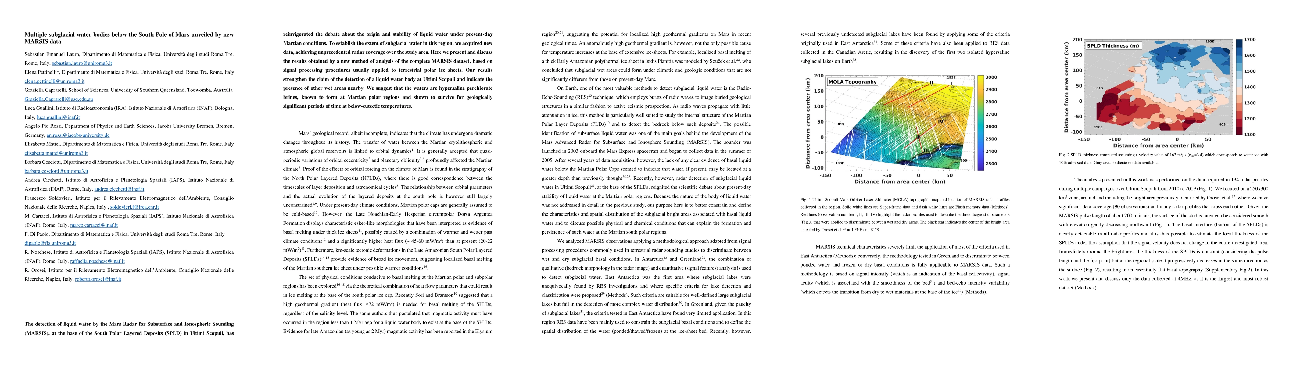 The Mars Advanced Radar for Subsurface and Ionosphere Sounding (MARSIS) has detected multiple subglacial water bodies beneath Mars' south polar ice, suggesting the presence of hypersaline perchlorate brines that could persist under current Martian conditions. This discovery, based on advanced signal processing techniques, supports the existence of liquid water in previously unknown regions.