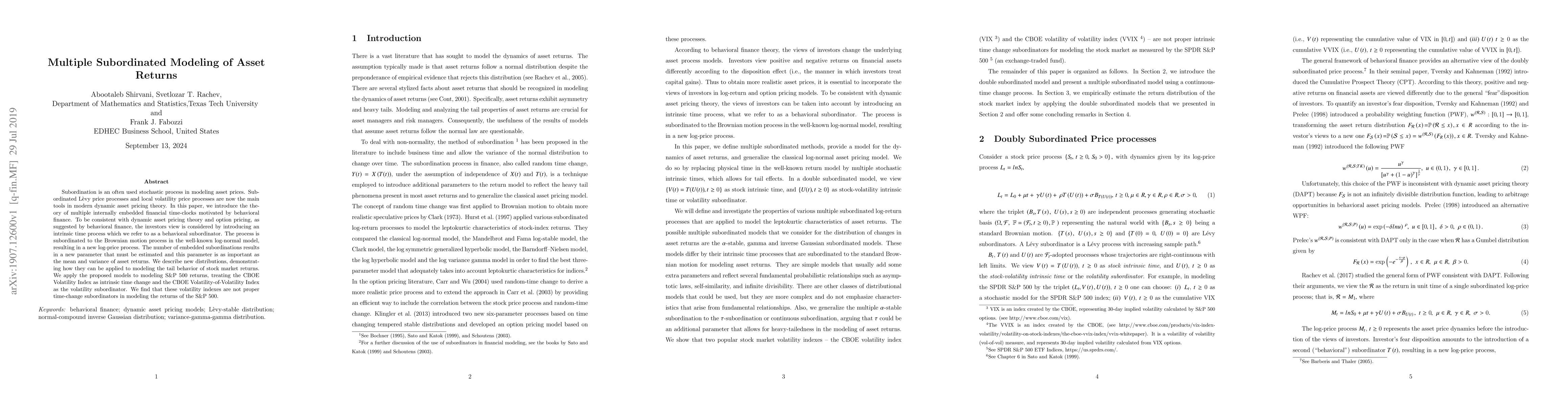 Subordination is an often used stochastic process in modeling asset prices. Subordinated Levy price processes and local volatility price processes are now the main tools in modern dynamic asset pricing theory. In this paper, we introduce the theory of multiple internally embedded financial time-clocks motivated by behavioral finance. To be consistent with dynamic asset pricing theory and option pricing, as suggested by behavioral finance, the investors' view is considered by introducing an intrinsic time process which we refer to as a behavioral subordinator. The process is subordinated to the Brownian motion process in the well-known log-normal model, resulting in a new log-price process. The number of embedded subordinations results in a new parameter that must be estimated and this parameter is as important as the mean and variance of asset returns. We describe new distributions, demonstrating how they can be applied to modeling the tail behavior of stock market returns. We apply the proposed models to modeling S&P 500 returns, treating the CBOE Volatility Index as intrinsic time change and the CBOE Volatility-of-Volatility Index as the volatility subordinator. We find that these volatility indexes are not proper time-change subordinators in modeling the returns of the S&P 500.